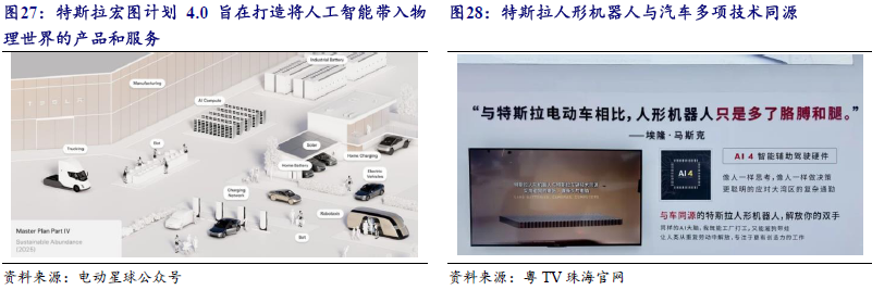 以机器人业务为例,特斯拉已构建起 “算法复用 + 硬件共源 + 制造降本 + 工厂应用” 的四位一体基础体系:(1)硬件与供应链:依托自身在电力电子 / 半导体、传感器及计算单元等领域的专业技术储备与采购规模优势,保障供应链的安全性并实现成本控制,比如自研 FSD 芯片等举措;(2)软件与 AI:Optimus 的数据收集、处理以及虚拟测试环节,都可以复用自动驾驶 FSD 业务投入巨额资金搭建的基础设施;(3)规模化制造:借助在全球超级工厂积累的大批量、高效率制造经验,助力机器人实现大规模生产;(4)数据飞轮:特斯拉分布于全球的工厂,本身就是收集训练数据、开展机器人迭代与验证工作的理想试验场。