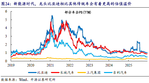 从具体车企来看,在这一阶段,比亚迪全力布局新能源车业务,持续推进刀片电池、e 平台、DM-i 等技术的研发工作,凭借高性价比的优势快速成长为国内新能源汽车领域的龙头企业。也正是因为比亚迪具备突出的成长性,相较于上汽、长城、长安、吉利等新能源转型节奏偏慢的车企,市场为比亚迪赋予了更高的估值溢价。