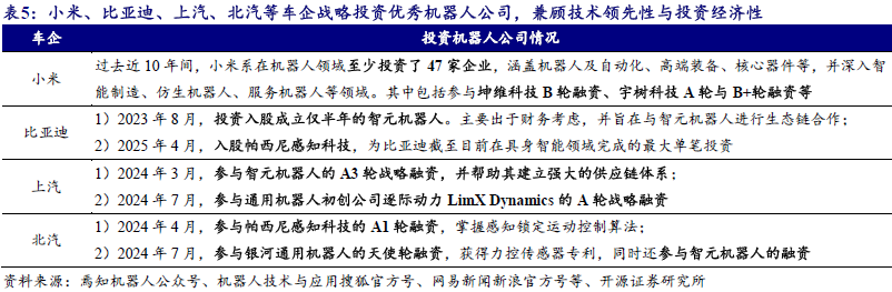 比亚迪、上汽、北汽等企业也都通过旗下投资平台,参股了多家在核心零部件、运动控制或 AI 算法上有特色的机器人公司。这种 “资本 + 产业” 的深度绑定,使车企能够紧密跟踪技术前沿,在机器人产业成熟时快速导入自身体系;同时也能为被投企业提供宝贵的应用场景和试炼场。