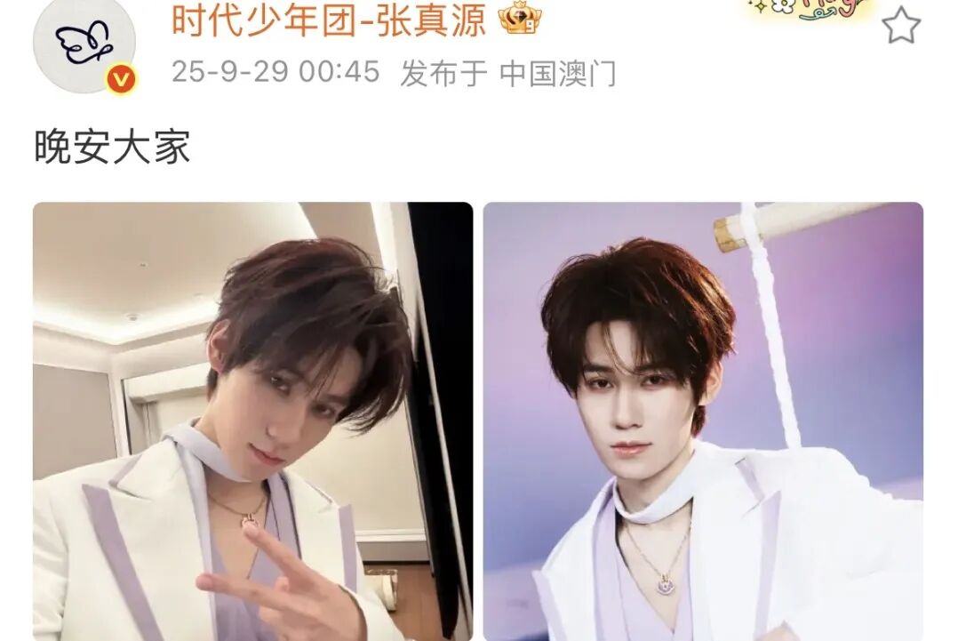 一张反手比耶,送给大家!精致的面庞,搭配浅色系的妆造。小张@时代少年团-张真源 就这样直直走进团团的心里,夜色已深,愿你有个安稳的睡眠~