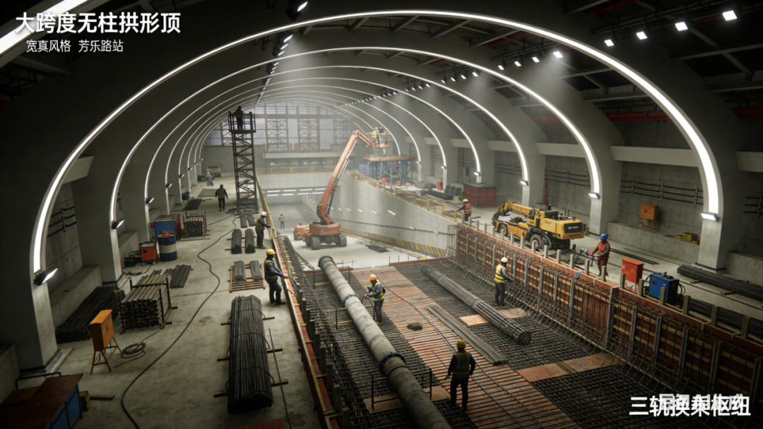车站位于芳乐路路口,沿联友路南北向布置,主体结构已完成封顶,目前正在进行换乘通道的施工。由于要预留多线换乘空间,车站设计采用了"大跨度无柱拱形顶"结构,施工难度不小。建设团队通过优化施工方案,采用"一次性模板支架 + 钢筋绑扎 + 跳仓浇筑"工艺,细化浇筑振捣工序,搭配自动水循环与无线测温系统,成功管控大体积混凝土水化热,杜绝了渗漏隐患。