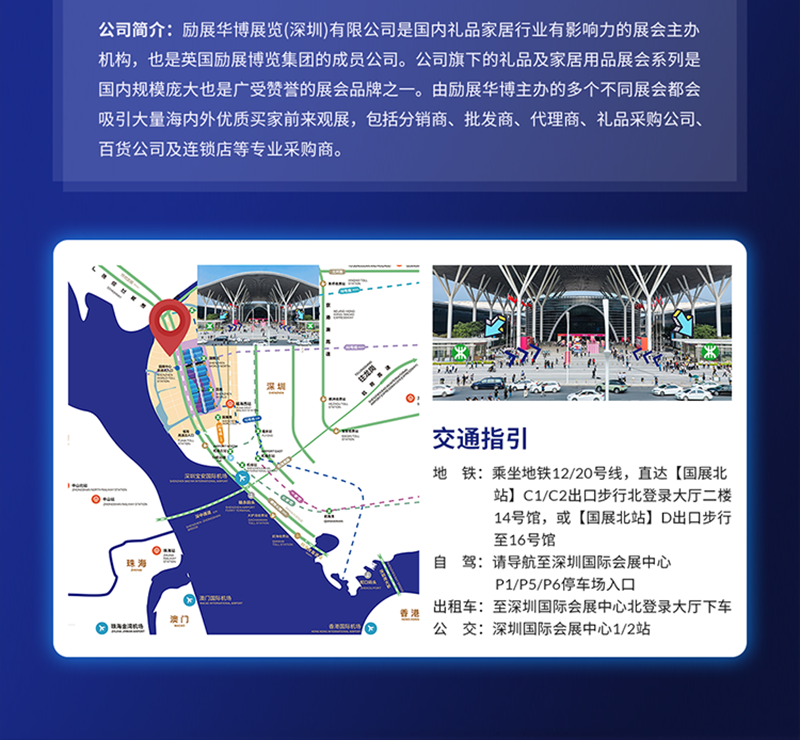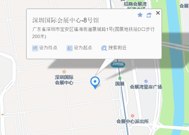12号线/20号线国展站C1/C2口,国展北站D口,直达深圳国际会展中心。