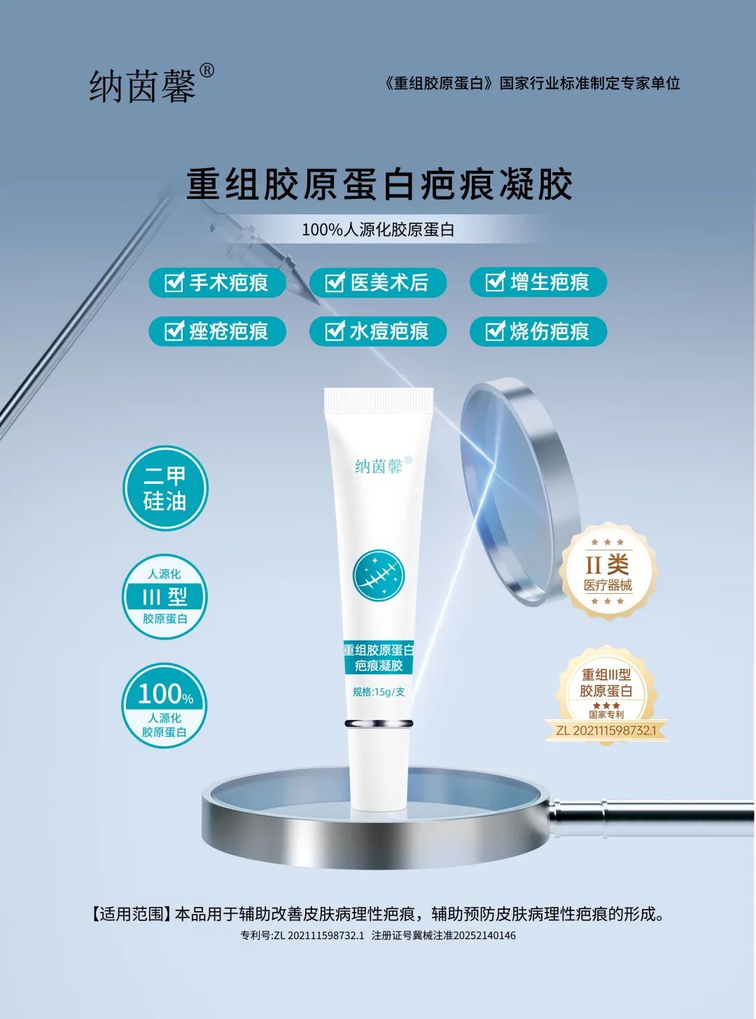 纳茵馨是以重组人源化胶原蛋白为核心成分的医疗器械品牌。纳科生物将重组人源化胶原蛋白应用到二类械品领域,以敷料、敷料贴、凝胶等形式,采用医护级标准,修护日常皮肤和黏膜健康问题。