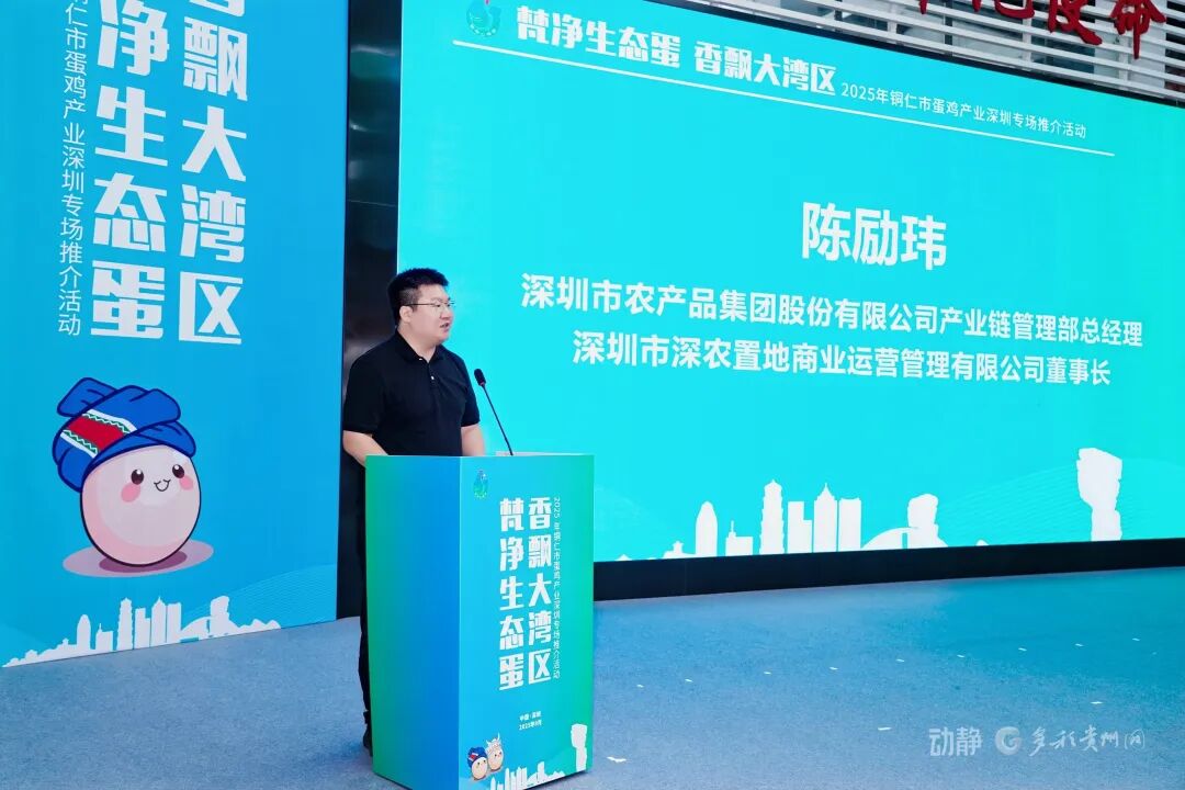 深圳市农产品集团股份有限公司产业链管理部总经理、深圳市深农置地商业运营管理有限公司董事长陈励玮在致辞中表达了对铜仁生态蛋品的高度认可。他表示,深圳农产品集团将积极利用自身市场网络和渠道优势,助力“梵净山鸡蛋”更好地走进大湾区千家万户,实现从产地到餐桌的优质供应。