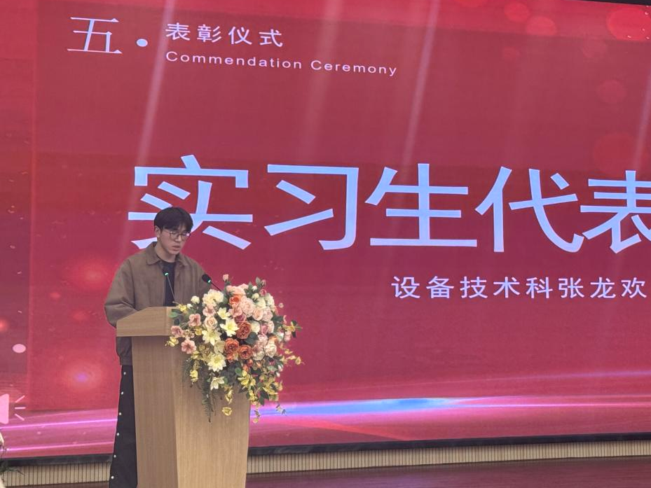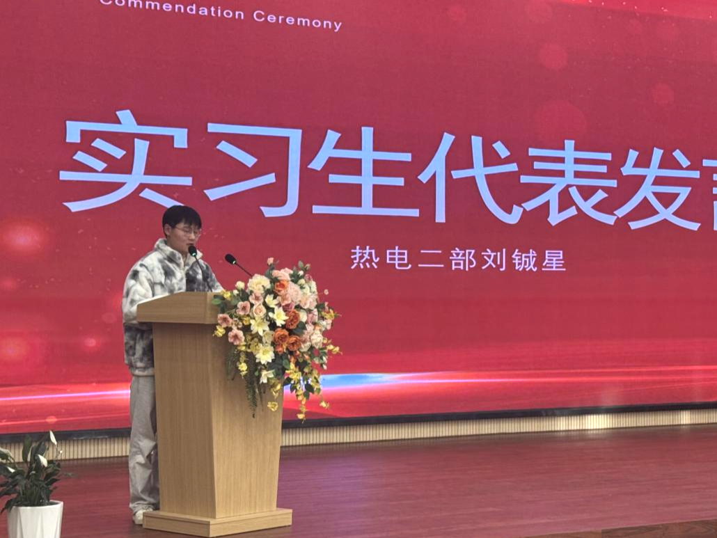 表彰环节后,智能制造学院电气2301班、现金凤凰设备技术科张龙欢、热电二部刘铖星作为实习生代表上台发言。他们深情回顾了实习阶段的 “心路历程”——从初入车间的忐忑,到逐步上手的熟练,再到独当一面的自信。同时,他们也清晰地阐述了个人后续的学习与发展规划,展现了美珈学子勤于反思、规划未来的良好风貌。他们的分享真诚而有力,赢得了现场阵阵掌声。