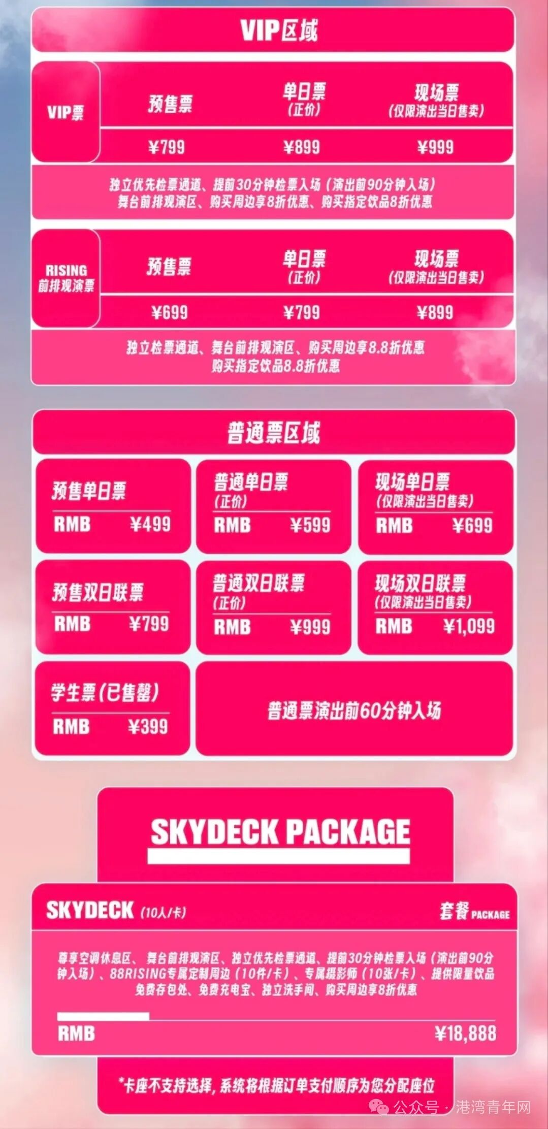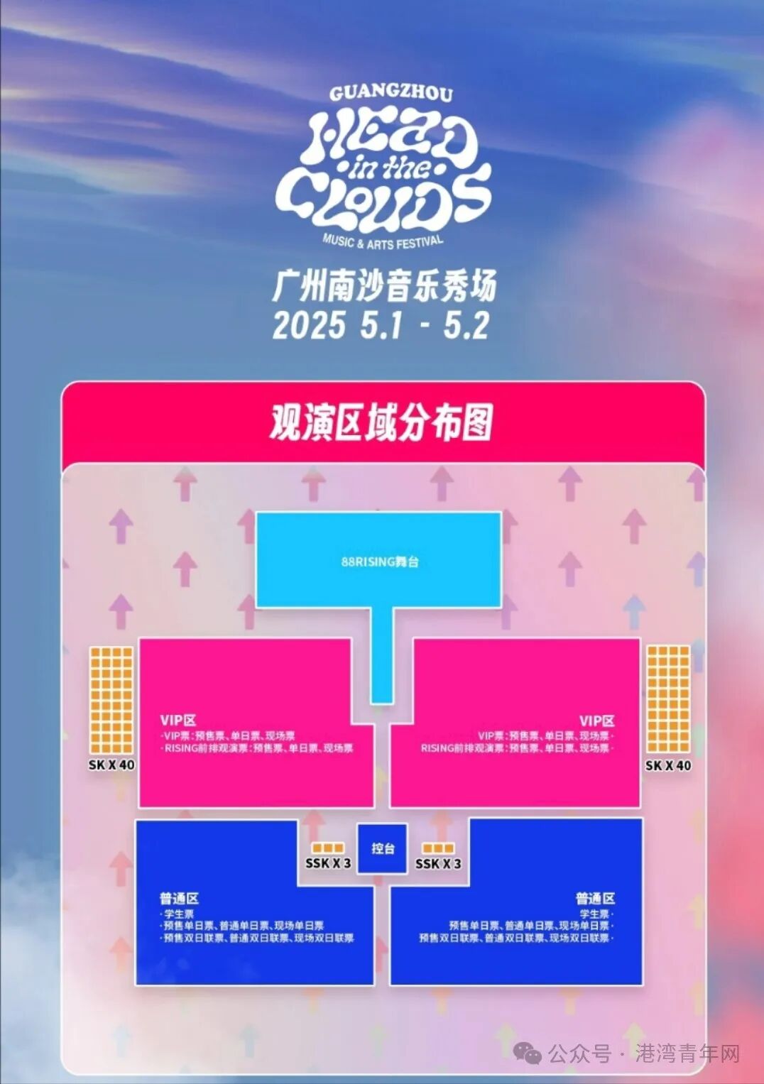 全場最炙手可熱的「SSK尊享卡座」僅有6組席位,位於舞台正中央控台旁,不僅坐擁最佳視野,更配備空調休息區、無限次出入VIP區、專屬定製周邊、免費飲品及獨立洗手間等頂級權益。更吸引人的是,透過攜程渠道購票的觀眾,還有機會獲得88rising親筆簽名照!若想將舒適度拉滿,卡座套餐更包含五星級酒店住宿與專車接送,讓你在炎熱的五月廣州「無痛」狂歡。