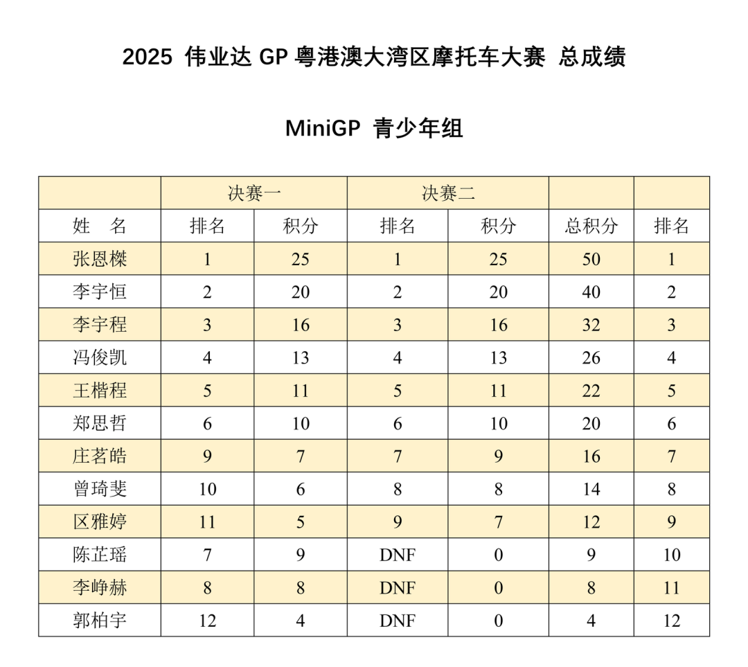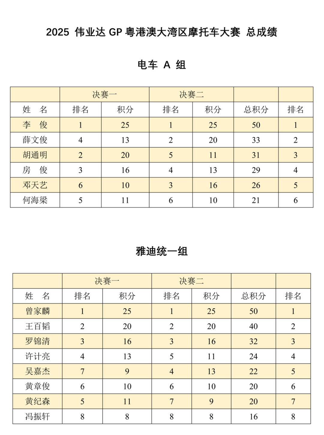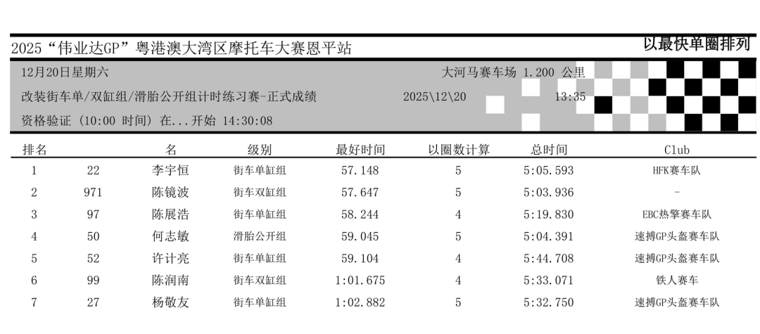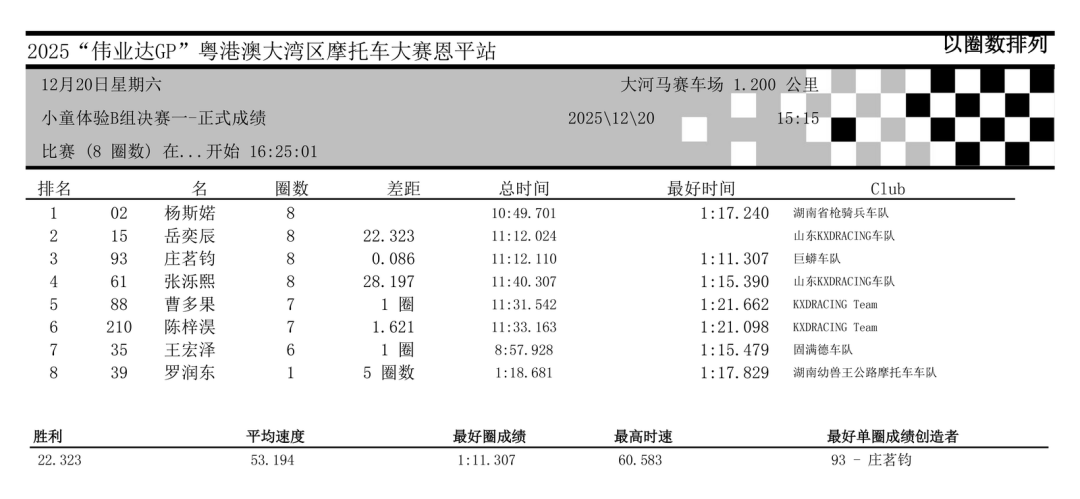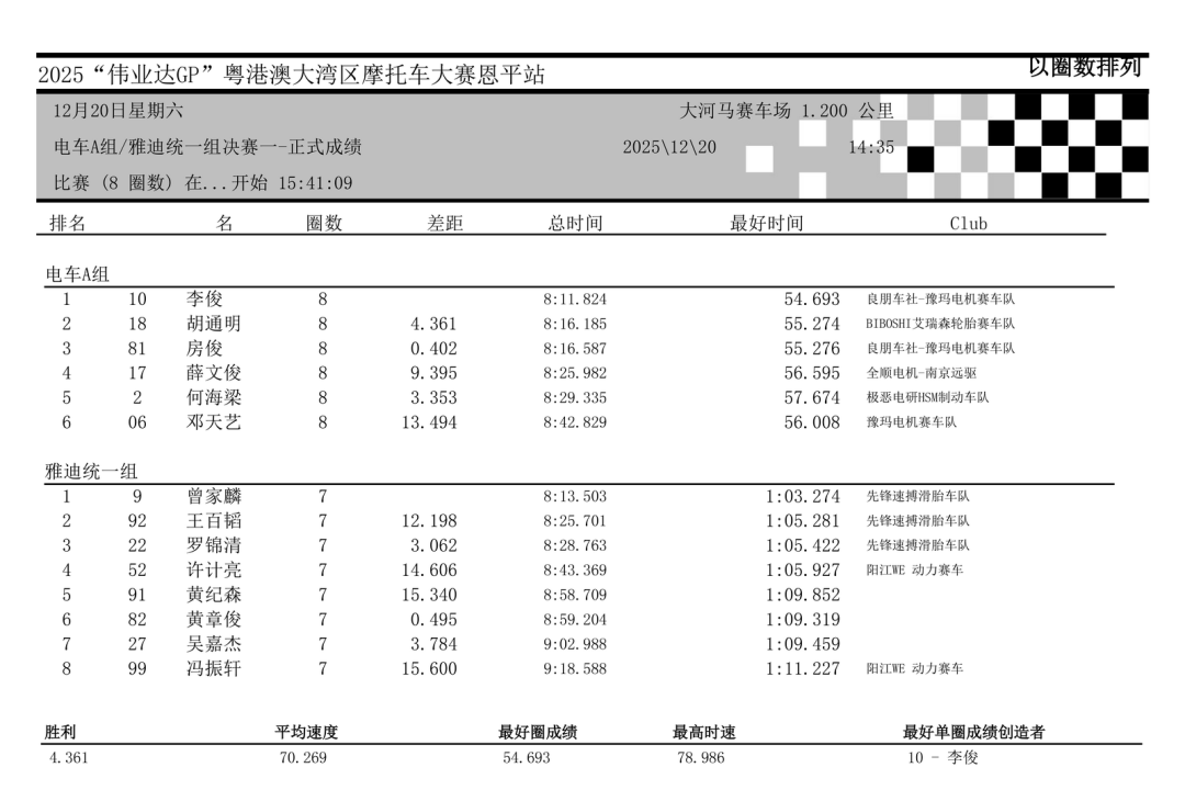 下面的图片,2025 伟业达 GP 粤港澳大湾区摩托车大赛恩平站,各竞赛组别的成绩和颁奖特写。