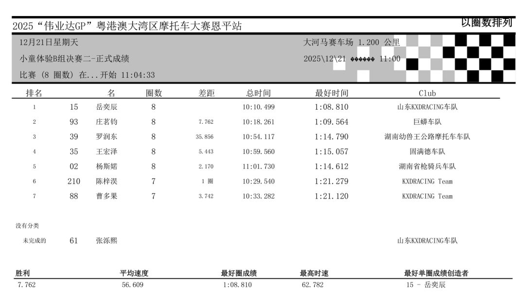 * 小童赛道体验 B 组:1 分 08.81 秒/岳奕辰,决赛二(新纪录);
