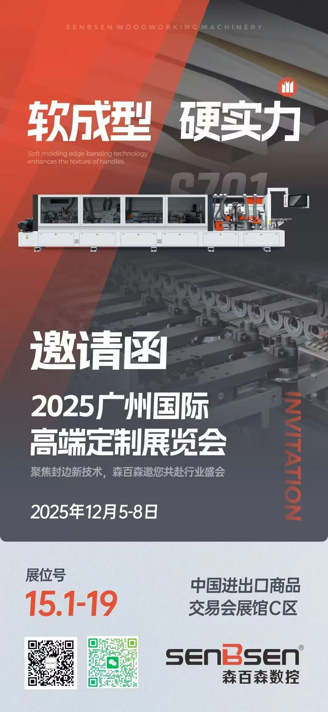 当高定家居迈入智造新纪元,总有先锋力量引领行业航向。2025年12月5-8日,高定设计周、高定展将在广交会C区重磅启幕,森百森作为深耕木工机械领域的标杆品牌,将再度携硬核实力隆重亮相,以科技赋能定制家居新生态!