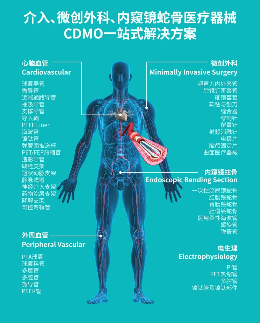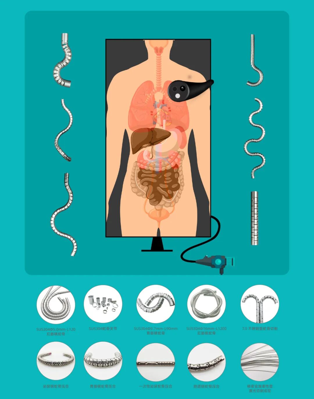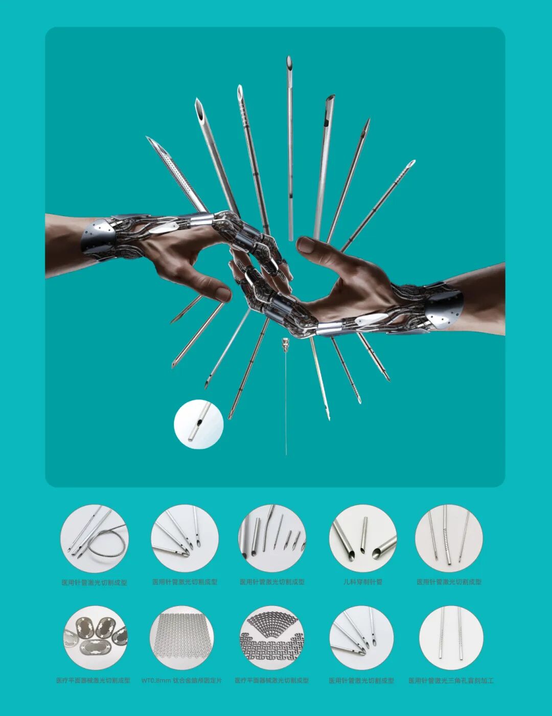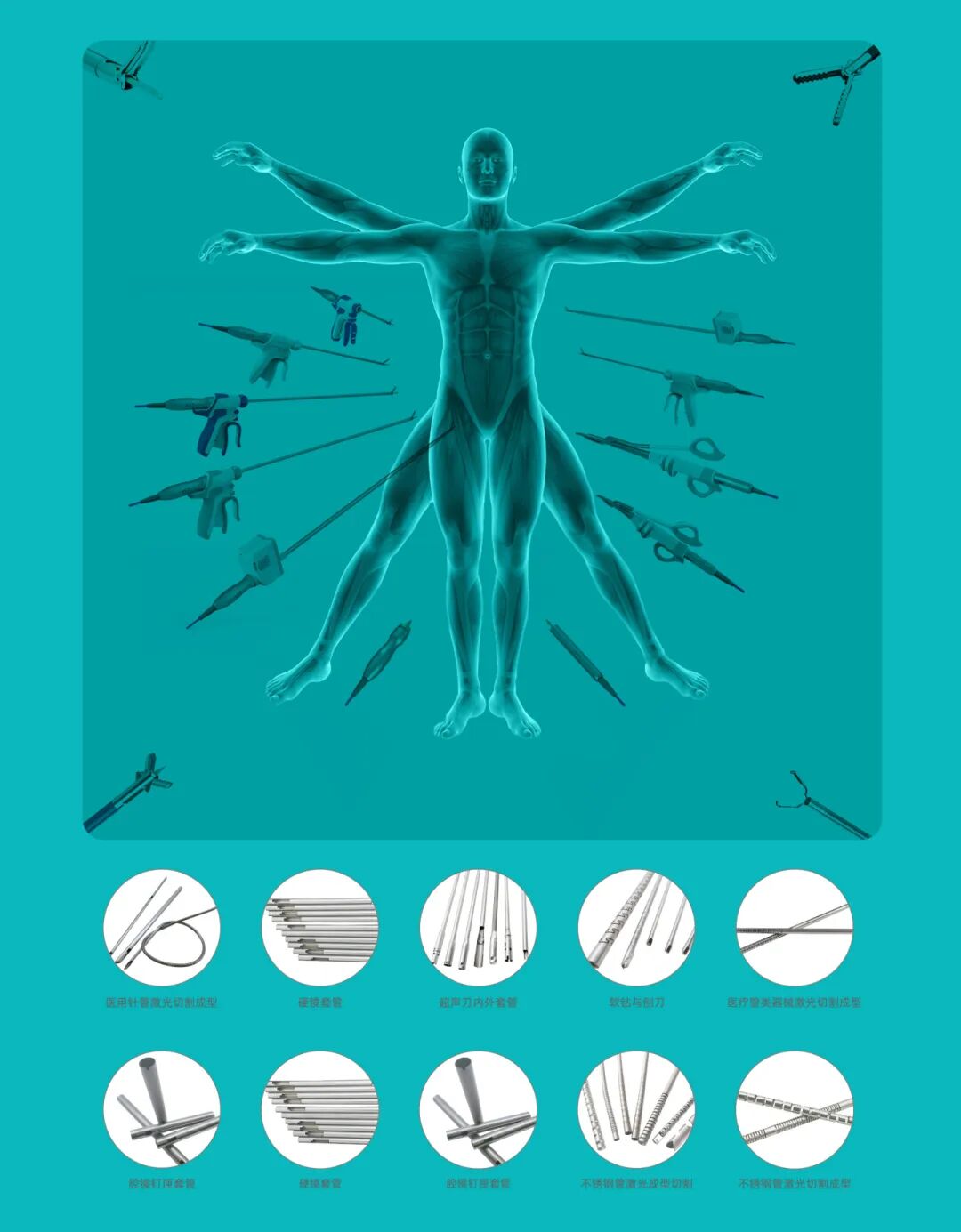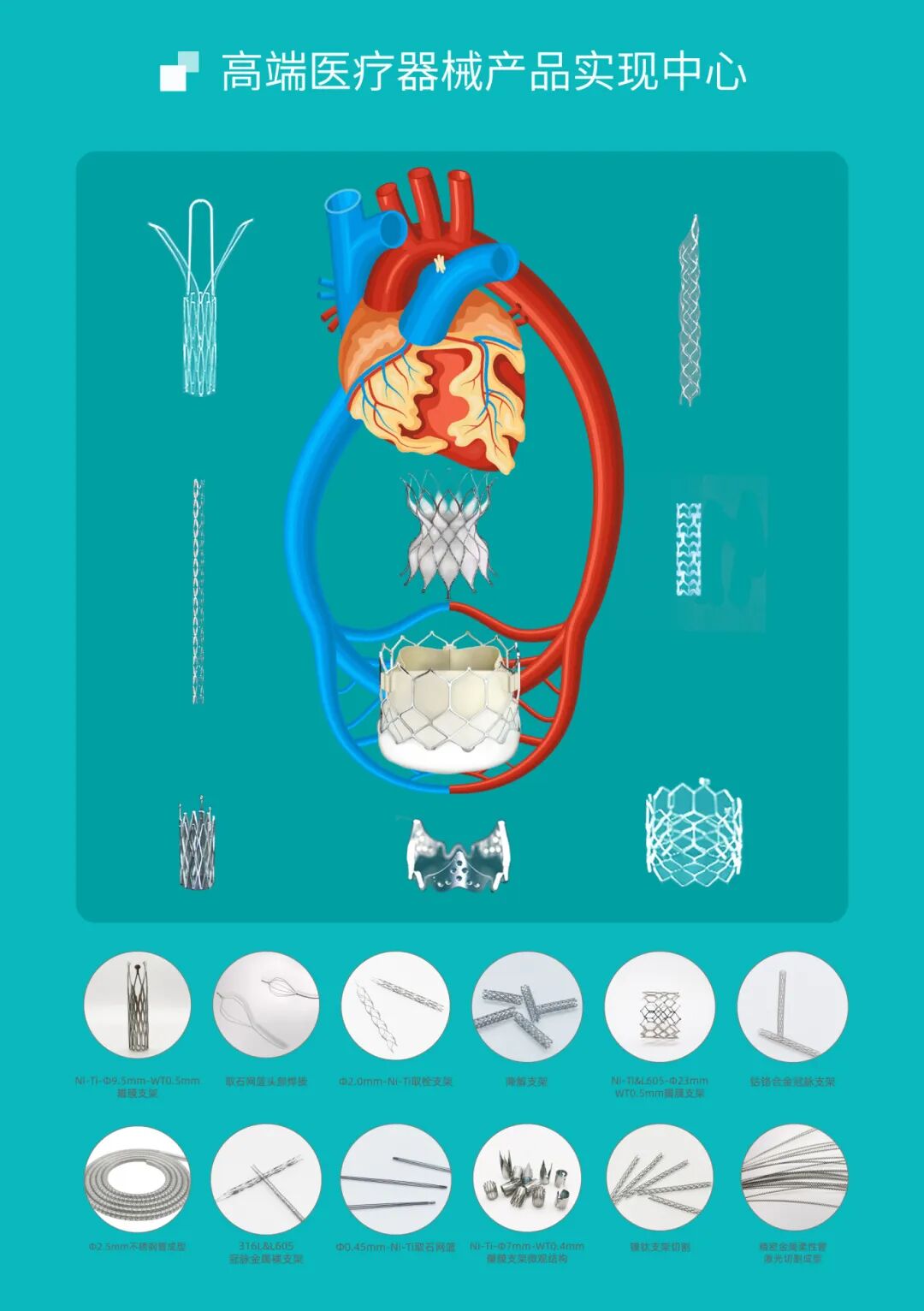 主要应用于介入式医疗器械(神经介入支架、冠脉支架、瓣膜支架等)、内窥镜蛇骨(泌尿镜蛇骨、肛肠镜蛇骨等)、外科手术器械(超声刀内外套管、针管、脑颅固定片等)等精密医疗器械领域。同时提供专业技能人才培养、加工母机与测试系统研制、开放式加工工程与测试实验室,并具备完善的质量管理体系及灯塔车间高效运转机制。