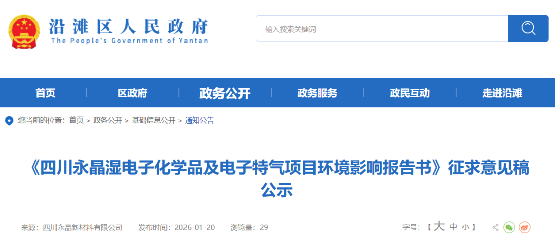 1月20日,四川永晶新材料有限公司湿电子化学品及电子特气项目环境影响报告书征求意见稿公示,项目相关情况如下: