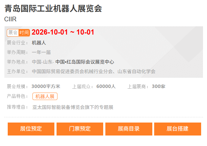 青岛国际工业机器人展览会CIIR【展位预定、门票预定、展商目录、展台搭建、差旅行程、签证、翻译、物流运输、补贴申报