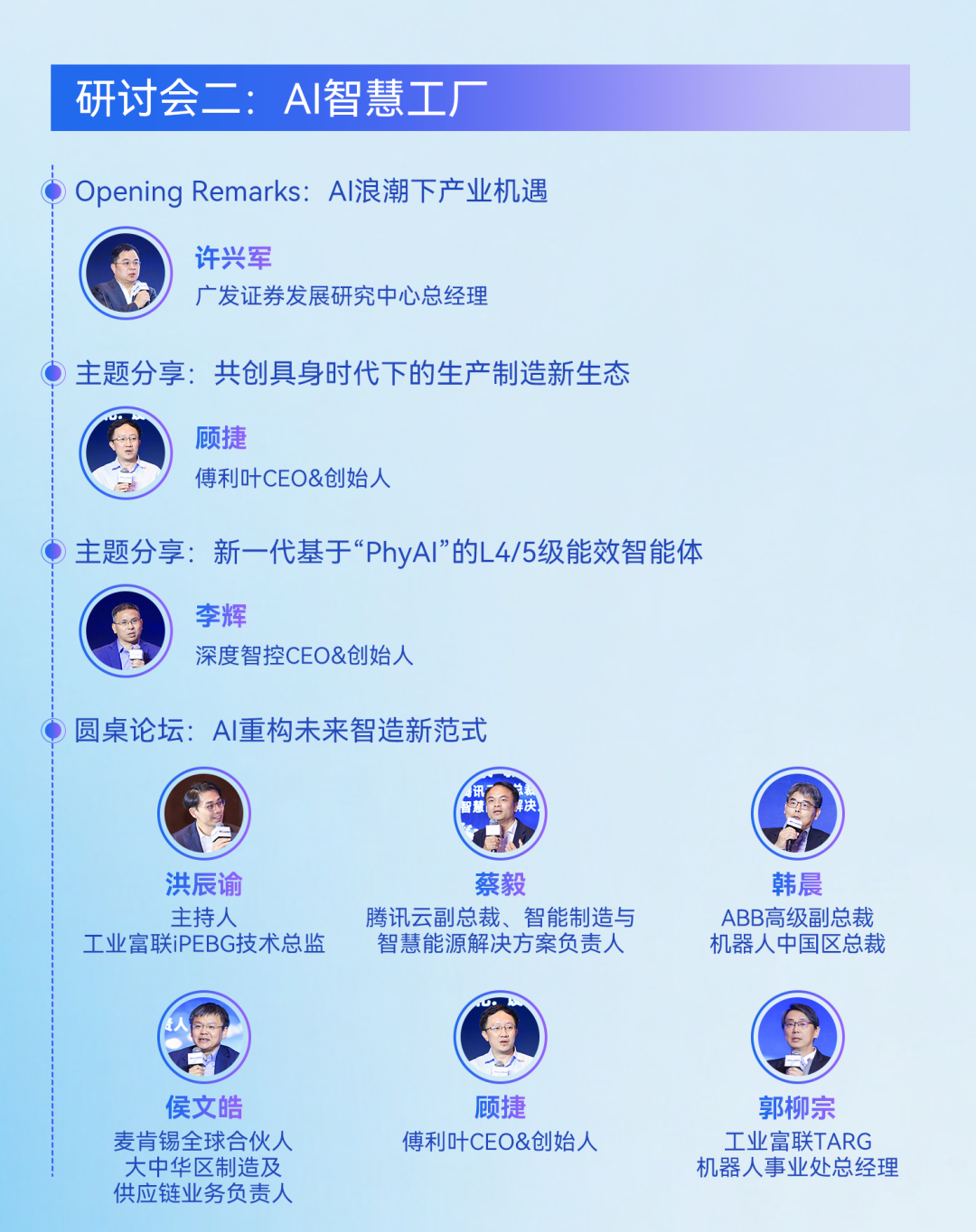 在“AI智慧工厂”专题,广发证券发展研究中心总经理许兴军分析了AI产业链资本开支与核心部件的供需态势;傅利叶创始人兼CEO顾捷聚焦具身智能,分享了人形机器人从硬件模块化到软件自主化的演进路径;深度智控创始人李辉介绍了L4-L5级能效智能体的技术突破,通过物理AI模型实现工业控制的自主优化与闭环运行。