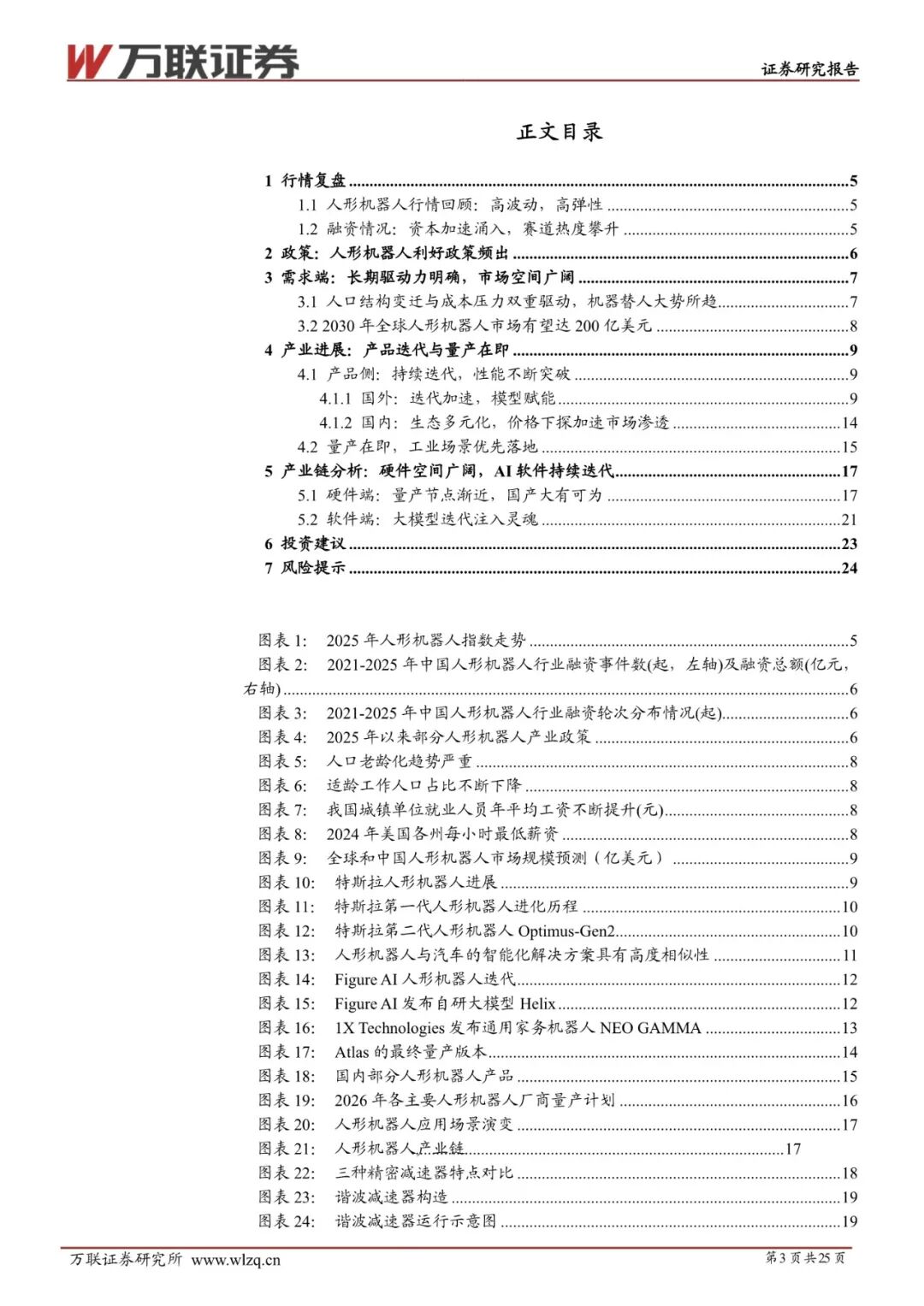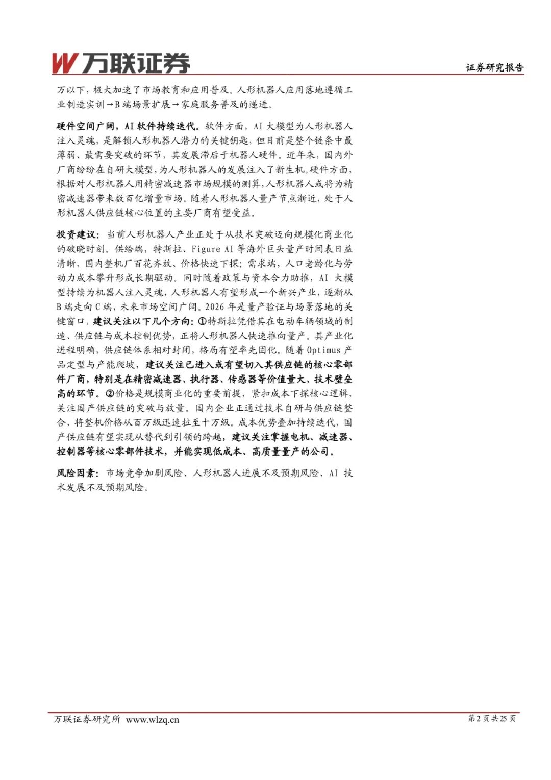 当前人形机器人产业正处在从技术突破迈向规模化商业化的破晓时刻,2026年或将成为量产落地与场景验证的关键窗口。供给侧,海外龙头量产路径清晰,国内整机加速迭代与价格下探,共同推动产业从样机走向规模交付;需求侧,老龄化加剧、人力成本上升构成长期需求,政策红利与资本热度持续加码。展望未来,场景落地有望遵循工业制造先行、B端场景扩展、家庭服务普及的梯度渗透路径,人形机器人的商业化进程有望迎来实质性突破,市场空间广阔,建议把握核心供应链机遇。