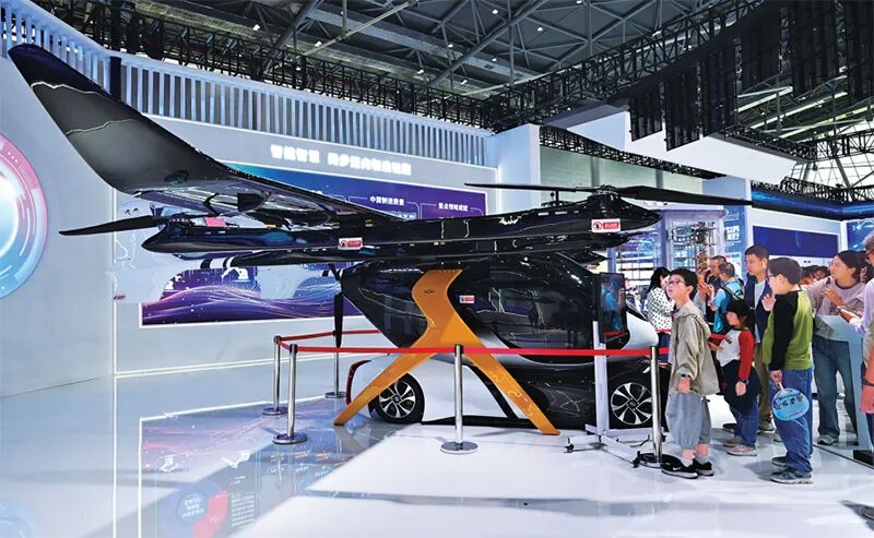 我国已经形成世界领先的优势产业矩阵。“十四五”以来,规上高技术制造业增加值年均增长9.2%。2025年9月20日,2025世界制造业大会在安徽省合肥市开幕。大会以“智造世界·创造美好”为主题,举办开幕式暨主旨演讲、重大项目对接、“十四五”制造业发展成就展示、重点产业链供应链供需对接等活动。图为9月20日观众在大会上观看一款飞行汽车。 新华社记者 周牧/摄