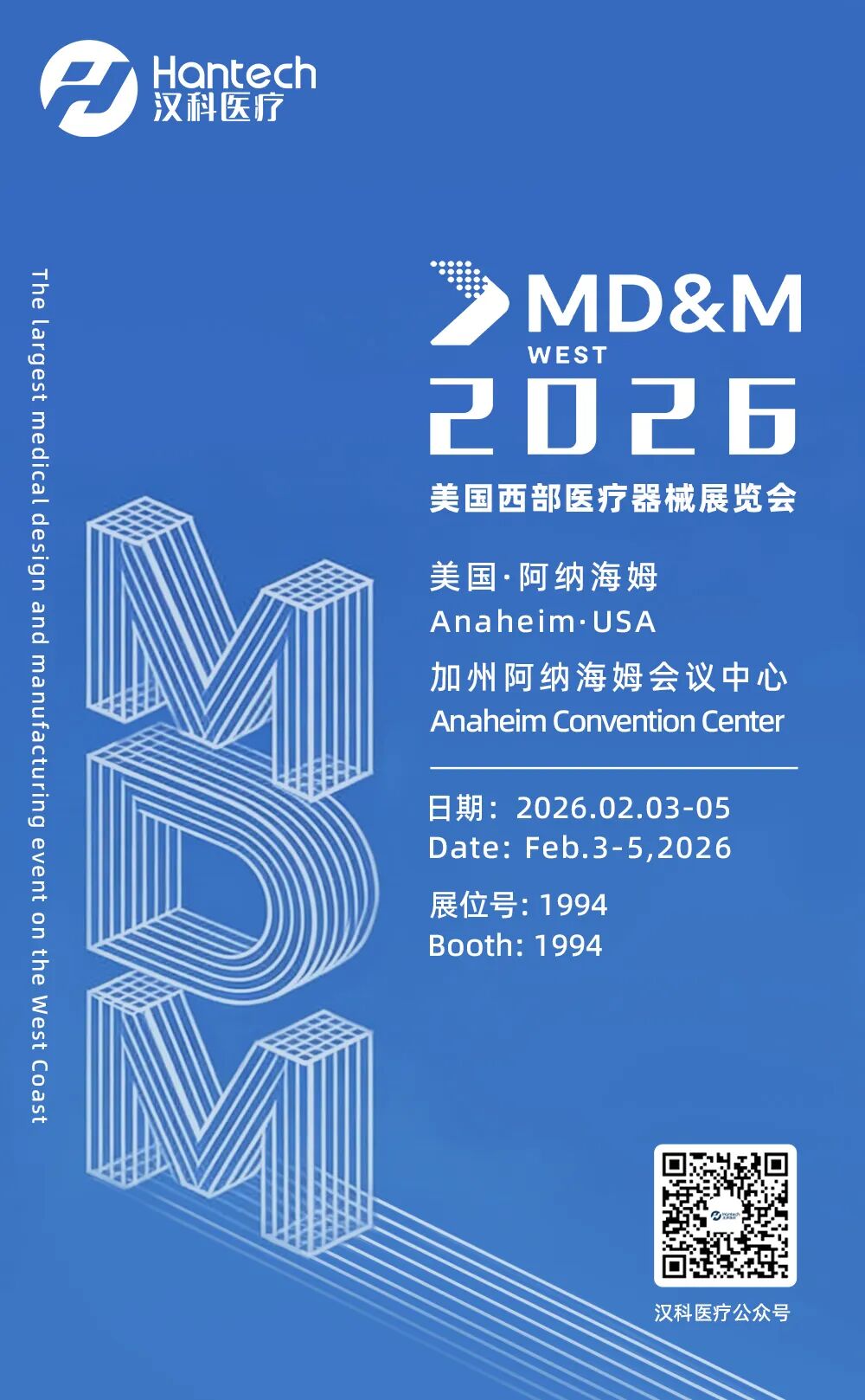汉科医疗将于2026年2月3至5日在美国加州阿纳海姆会议中心参加美国西部医疗器械展览会。我们期待与您相约展位1994