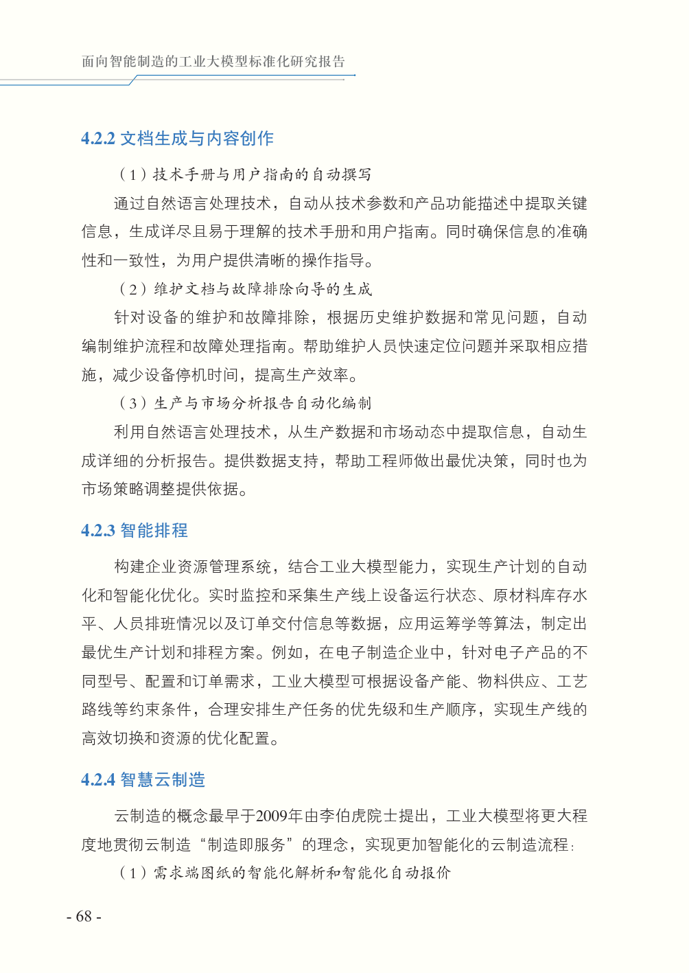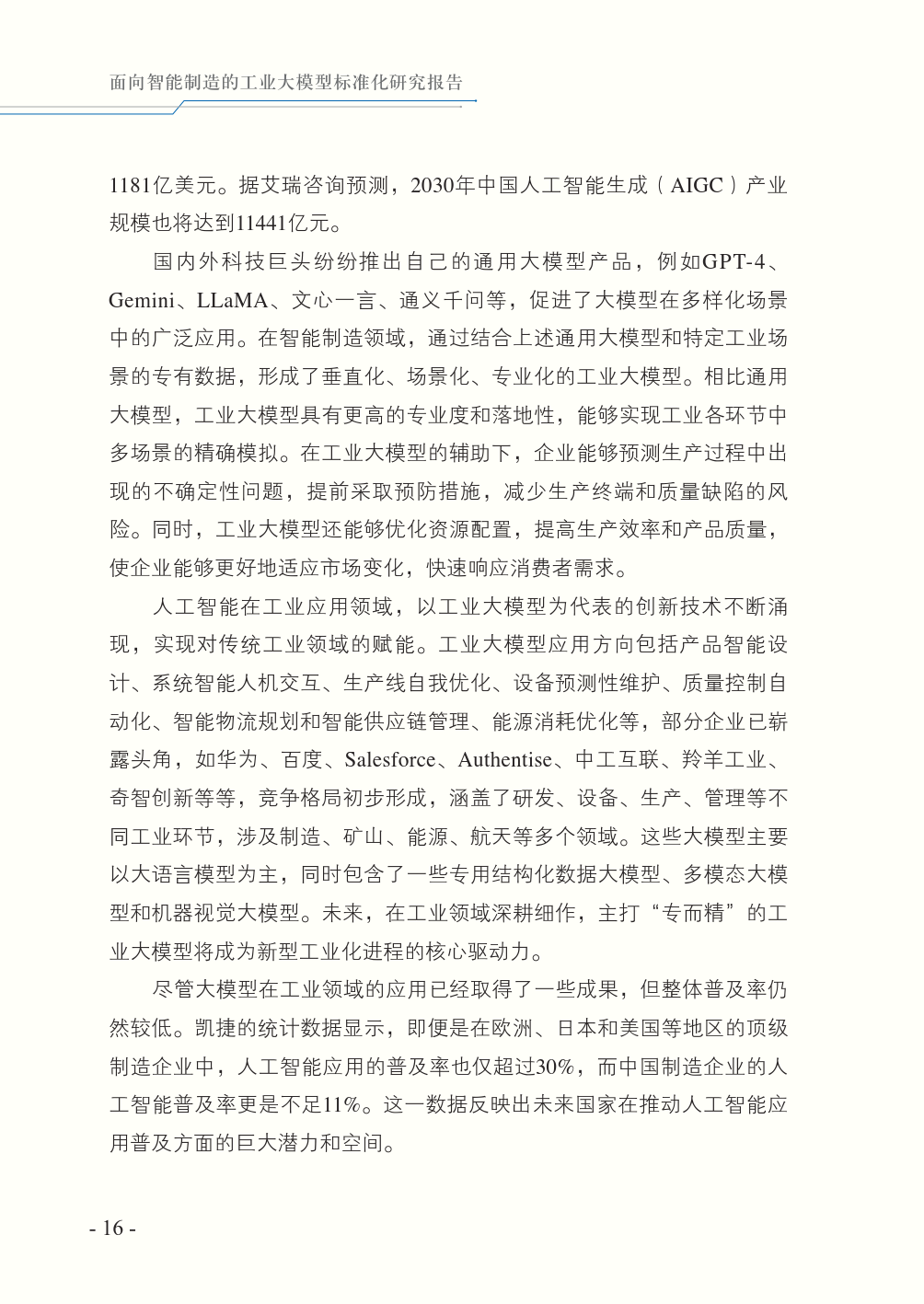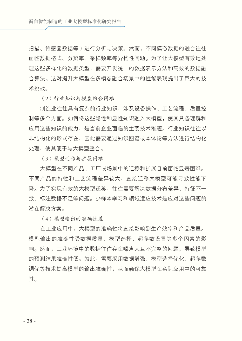 工业大模型在智能制造中的持续发展完善及推广离不开统一、全面和协调的标准体系。然而,随着工业大模型的深入应用,工业大模型标准化工作面临工业场景复杂、数据质量参差不齐、技术更新迭代快、隐私泄露等多方面难题。如何构建普适的、行之有效的标准体系,充分发挥工业大模型的潜力与价值,已然成为当前亟待解决的关键挑战之一。为此,中国电子技术标准化研究院联合各参编单位启动并编制了《面向智能制造的工业大模型标准化研究报告》,具体围绕以下七大主题展开: