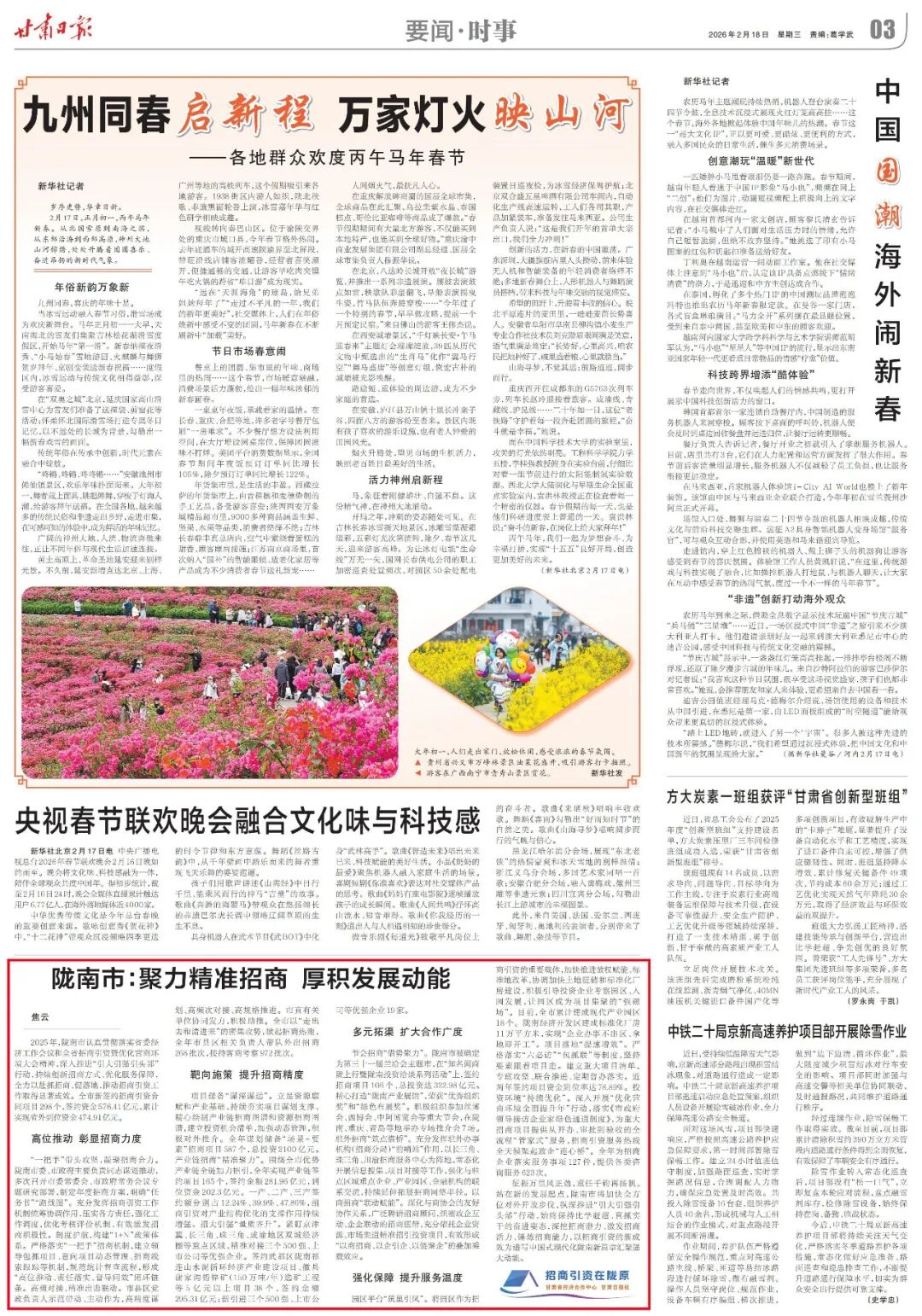 节会招商“借势聚力”。陇南市被确定为第三十一届兰洽会主题市,在“知名闽商陇上行暨陇南投资洽谈系列活动”上,签约招商项目106个、总投资达322.98亿元。精心打造“陇南产业展馆”,荣获“优秀组织奖”和“绿色布展奖”。积极组织参加丝博会、西博会、中阿博览会等重大节会,在陇南、重庆、青岛等地举办专场推介会7场。驻外招商“筑点搭桥”。充分发挥驻外办事机构(招商分局)“前哨站”作用,以长三角、珠三角、川渝招商服务中心为阵地,常态化开展信息搜集、项目对接等工作,强化与驻点区域重点企业、产业园区、金融机构的联系交流,持续延伸拓展招商网络半径。以商招商“联动赋能”。深化与商协会的友好协作关系,广泛聘请招商顾问,织密政企互动、企企联动的招商纽带,充分依托企业资源、市场渠道精准招引投资项目,有效形成“以商招商、以企引企、以链聚企”的叠加乘数效应。