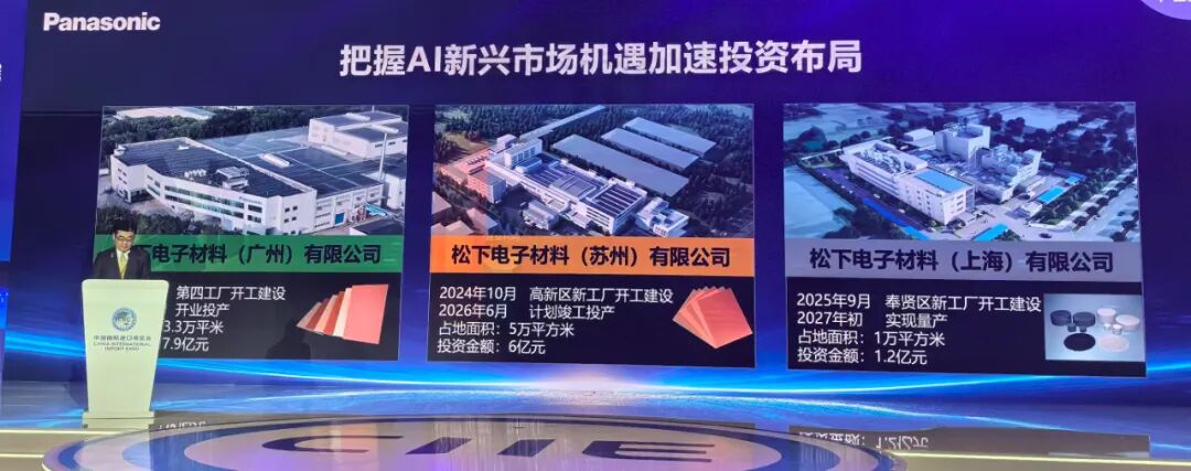 为夯实 AI 战略根基,松下近两年加速研发与生产投资,形成 “三地联动” 的产业布局。2023 年 9 月,投资 7.9 亿元的广州电子材料第四工厂投产,聚焦信息通信基础设施用多层基板材料,产能提升 1.3 倍;2024 年 10 月,投资6 亿的苏州电子材料新项目开工,打造 5 万平方米智能绿色工厂,专攻半导体封装基板材料;2025 年 9 月,上海电子材料新工厂动工,1.2 亿元投入将完善半导体材料供应链,投产后产值翻倍。三地工厂总投资超 15 亿元,构建起覆盖 AI 基础设施核心材料的完整产业链。