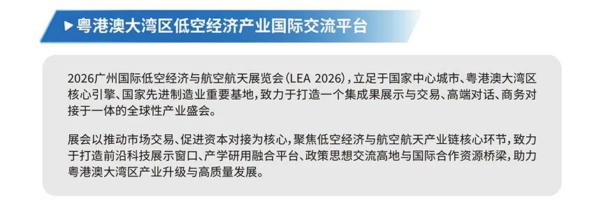 2026广州国际低空经济与航空航天展览会(简称:LEA 2026),将于2026年6月3-5日在广州·广交会展馆D区举办!展会立足于国家中心城市、粤港澳大湾区核心引擎、国家先进制造业重要基地,致力于打造一个集成果展示与交易、高端对话、商务对接于一体的全球性产业盛会。