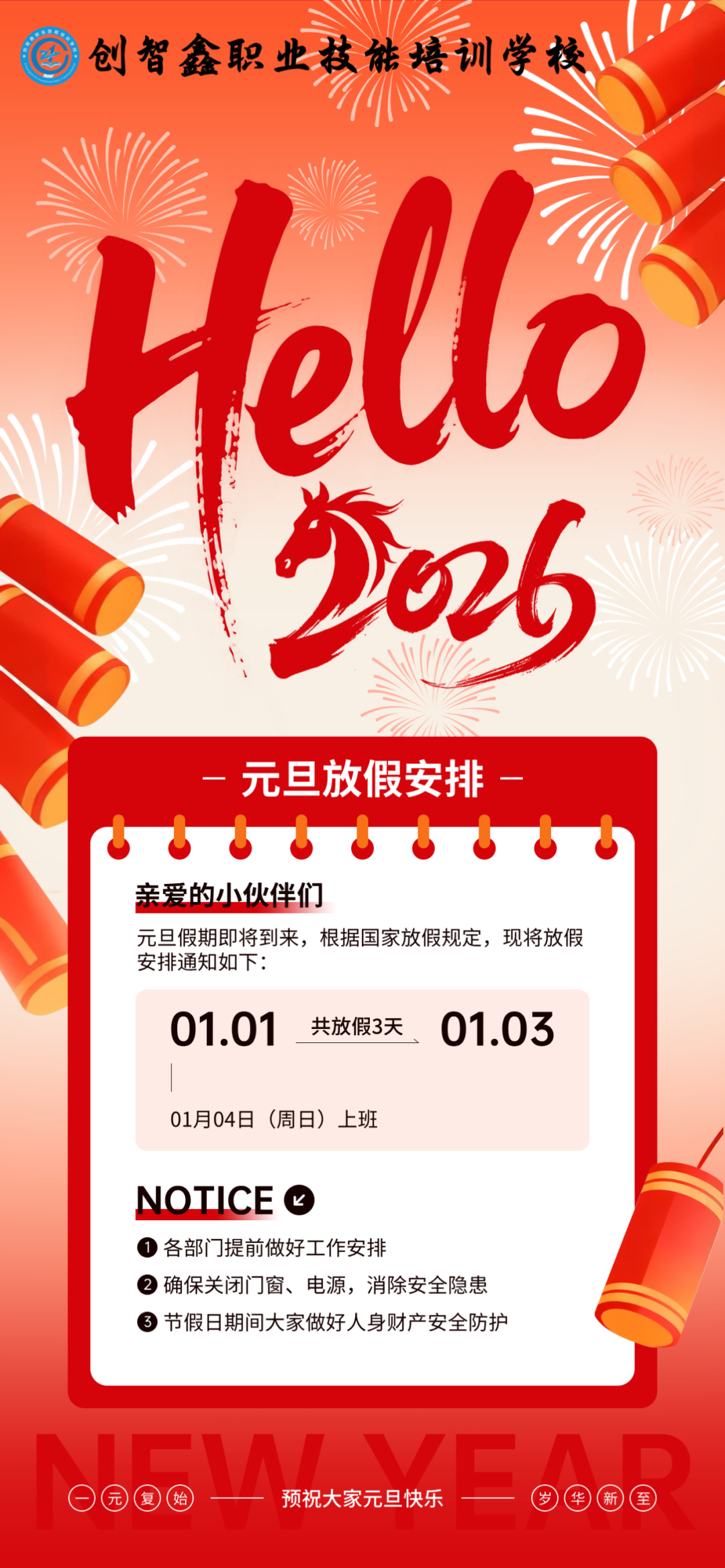 当冬日的暖阳洒满实训车间,当新年的钟声即将敲响,我们挥手作别满载收获的2025,满怀憧憬迎接崭新的2026。在这辞旧迎新的美好时刻,创智鑫职业技能培训学校全体教职工,向每一位勤奋追梦的学员、信任支持我们的家长与合作伙伴,致以最诚挚的新年祝福!愿大家新岁启封,喜乐长安,万事顺遂!