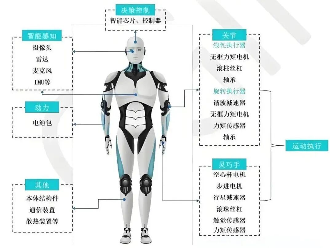 人形机器人产业链自上而下可分为:上游核心零部件包括减速器、伺服电机、控制器、丝杠、传感器等;中游本体制造与系统集成包括机器人本体制造、控制系统集成、整机装配;下游应用场景包括工业制造、物流仓储、商业服务、家庭服务、特种作业等。下图为人形机器人零部件示意图,截自东方财富网,2025年3月人形机器人产业解析: