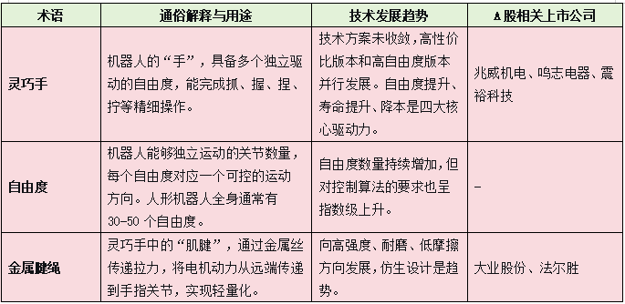 二是灵巧手尚未达标。复杂操作如使用筷子、拧螺丝仍困难重重,距离人类手指的精细控制仍有差距。一只灵巧手通常需要一二十个自由度,每个手指需要独立驱动,对微型电机、腱绳传动、力传感器的要求极高。当前技术方案尚未收敛,本体厂商自研与第三方供应并行,高性价比版本和高自由度版本均有发展空间。