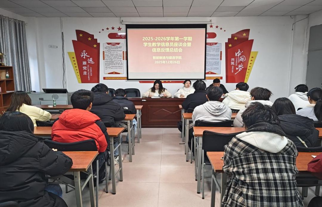 为进一步提升教学质量,加强学生与教师之间的沟通。2025年12月26日,智能制造与建造学院在仙女湖校区B栋104会议室召开2025-2026学年第一学期学生教学信息员座谈会暨信息反馈总结会,本次会议由教学督导员韩慧芳主持,李磊磊、李红艳两位老师及各班学生教学信息员参加。