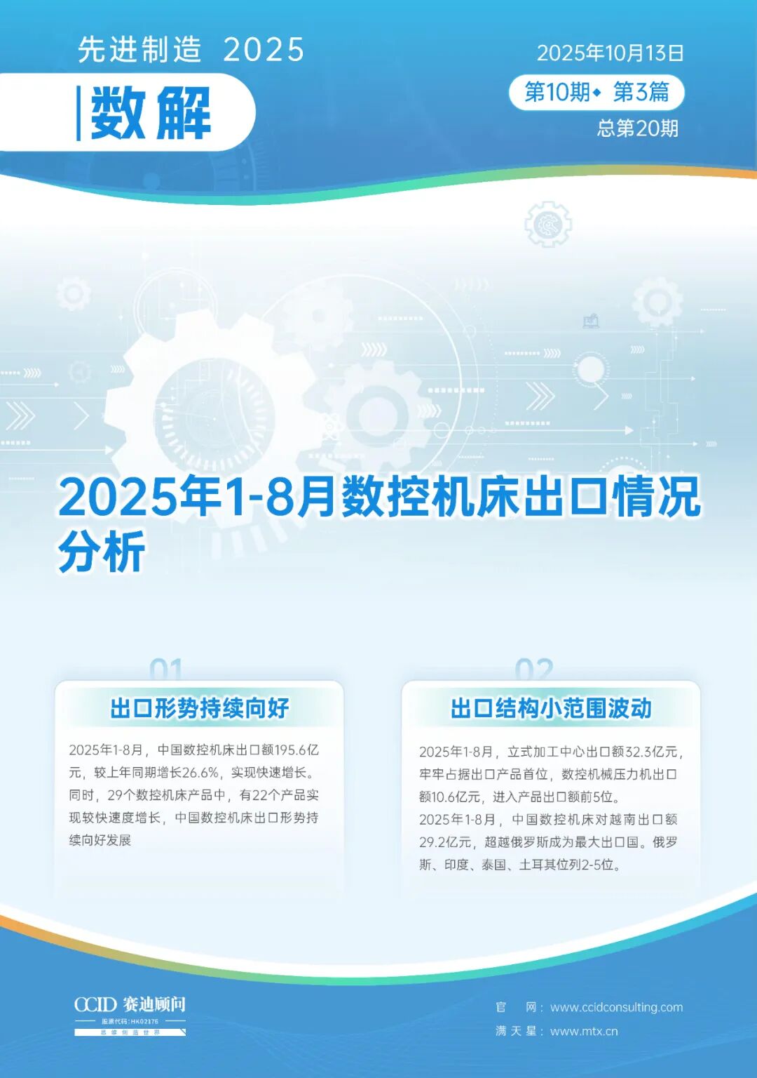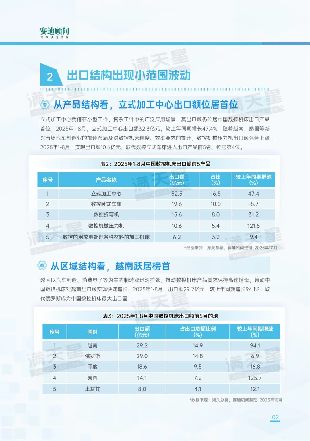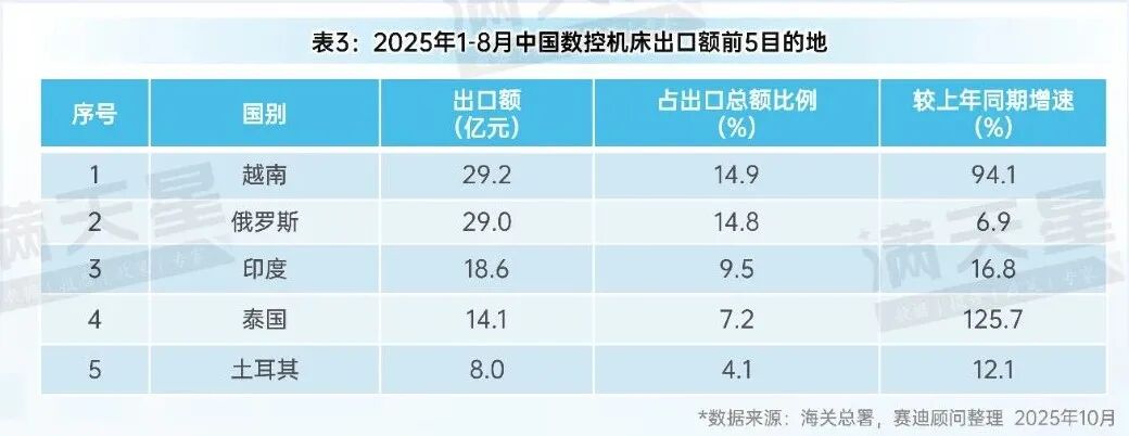 越南以汽车制造、消费电子等为主的制造业迅速扩张,推动数控机床产品需求保持高速增长,带动中国数控机床对越南出口额实现快速增长,2025年1-8月,出口额29.2亿元,较上年同期增长94.1%,取代俄罗斯成为中国数控机床最大出口国。