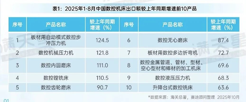 立式加工中心凭借在小型工件、复杂工件中的广泛应用场景,其出口额仍位居中国数控机床出口产品首位,2025年1-8月,立式加工中心出口额32.3亿元,较上年同期增长47.4%。随着越南、泰国等新兴市场汽车制造业的加速布局及对数控机床精度、效率要求的提升,数控机械压力机出口额强势上涨,2025年1-8月,实现出口额10.6亿元,取代数控立式车床进入出口产品前5名,位居第4位。