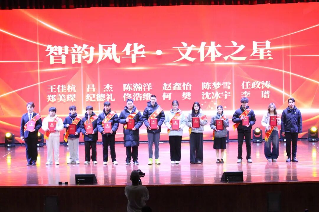 严锦隆、曾钰轩、孙飞、梁宁等老师先后为志愿服务先进个人、“智韵风华・文体之星”“智汇团旗双优”代表、“德智双优领航骨干”代表颁奖。学院54名志愿者全年完成86场次赛事保障服务,覆盖人群超2万人次;文体学子在校级以上赛事斩获31项荣誉,尽显青春风采。汤六狼、姚康、苏楠老师分别为最佳“匠心”“智辅”“筑梦”小班颁奖,肯定班主任助理在班级建设中的重要作用。随后,学院学生会主席仇高伟分享成长感悟,传递学生骨干的责任担当;王佳杭、陈宇同学演唱《逆光》,用旋律诠释逐梦初心。