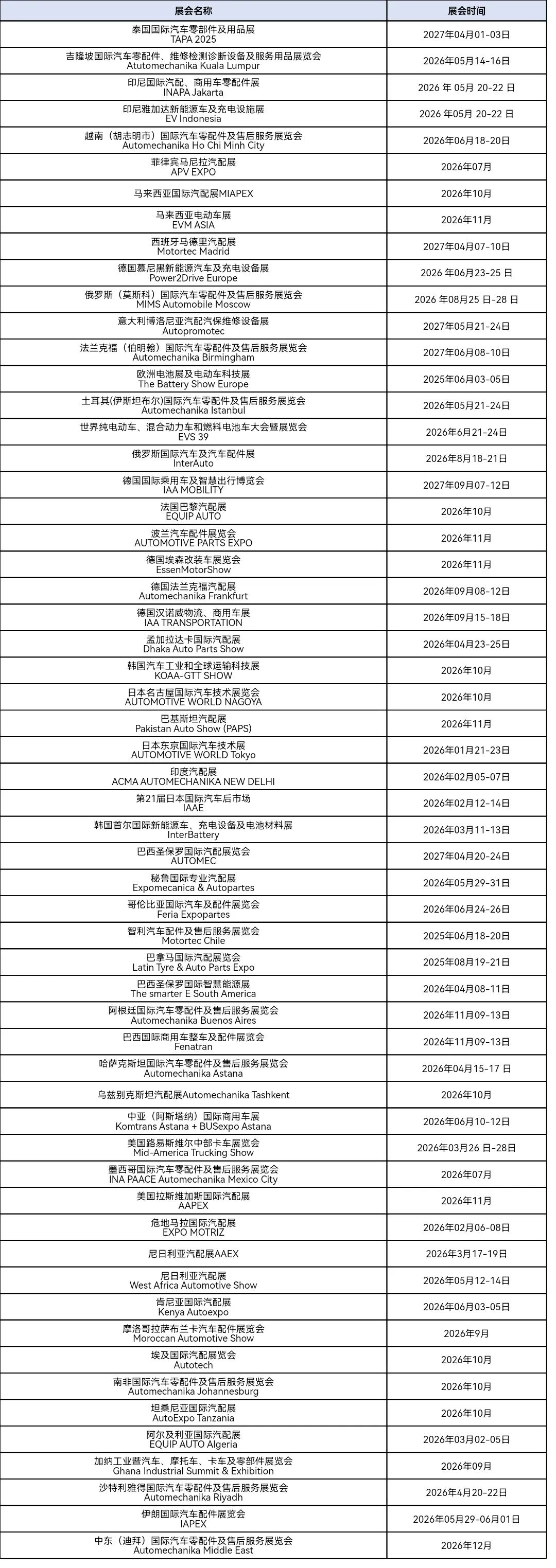 2026年全球汽配展会计划表