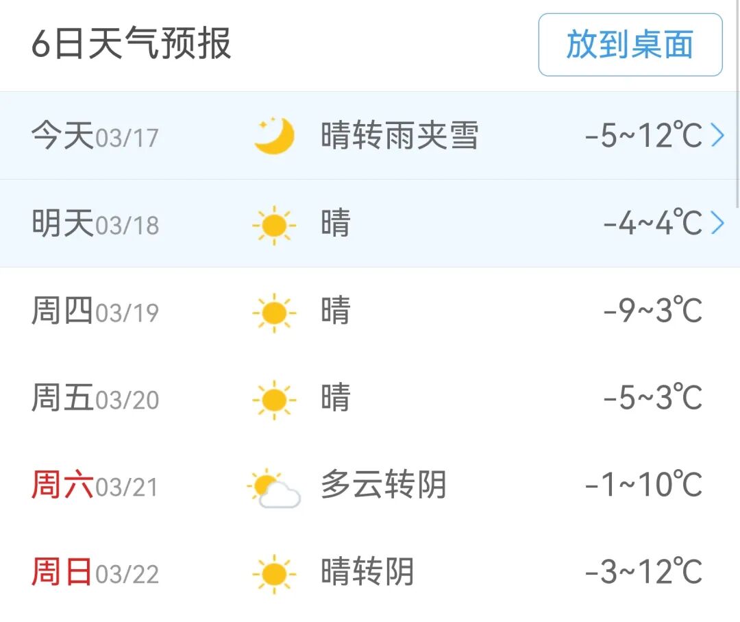 今天白天到夜间,晴转小雪,偏南风3-4级转西北风2-3级,瞬时风力可达6级。