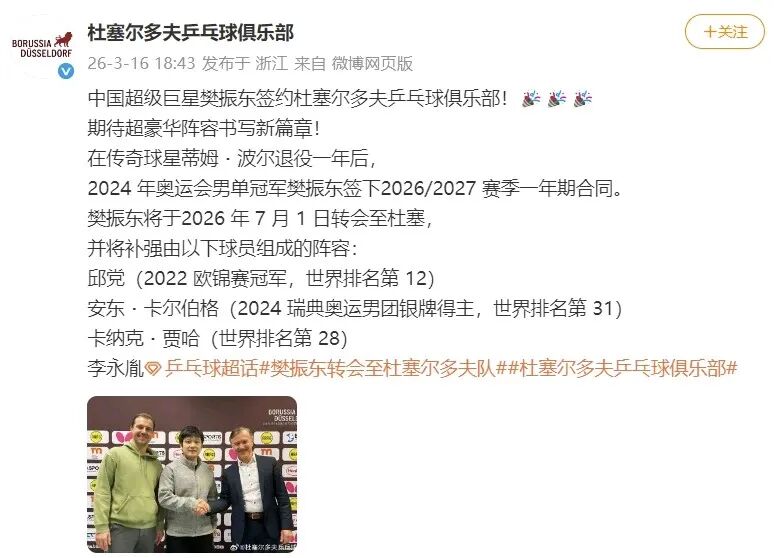 3月16日,杜塞尔多夫乒乓球俱乐部官宣樊振东加盟:樊振东将于2026年7月1日转会至杜塞。