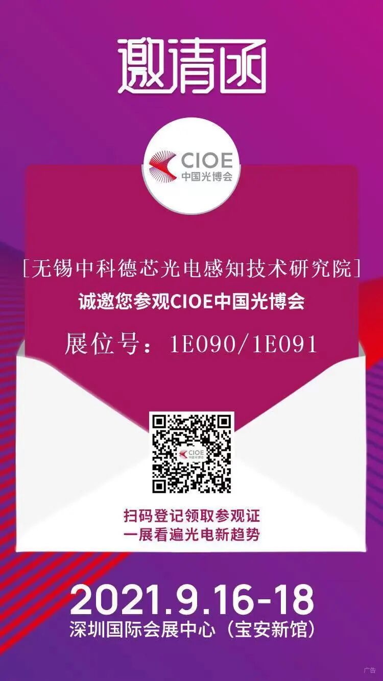 第23届中国国际光电博览会将于2021年9月16-18日在深圳国际会展中心(宝安新馆)举办!无锡中科德芯光电感知技术研究院有限公司将携旗下展品莅临展会,诚挚邀请业界同仁及专业观众莅临1E090/1E091参观、交流及业务洽谈!