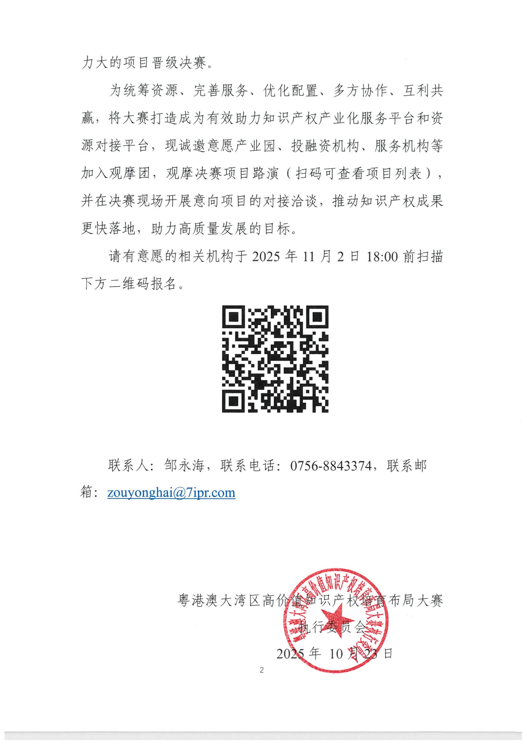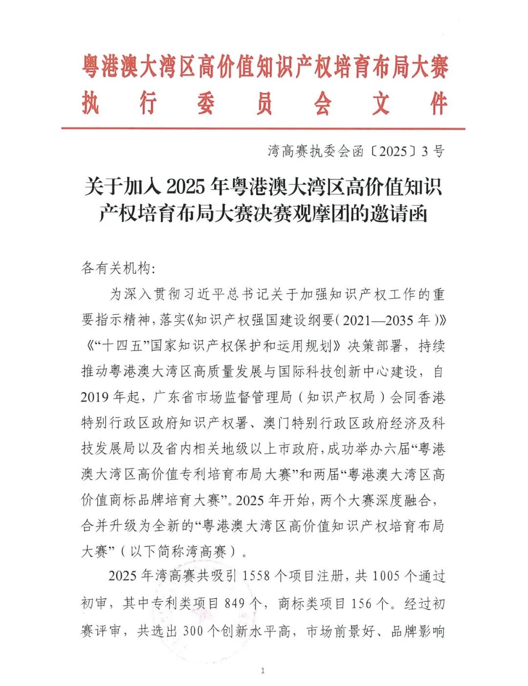 关于加入2025年粤港澳大湾区高价值知识产权培育布局大赛决赛观摩团的邀请函