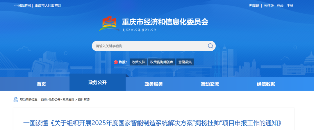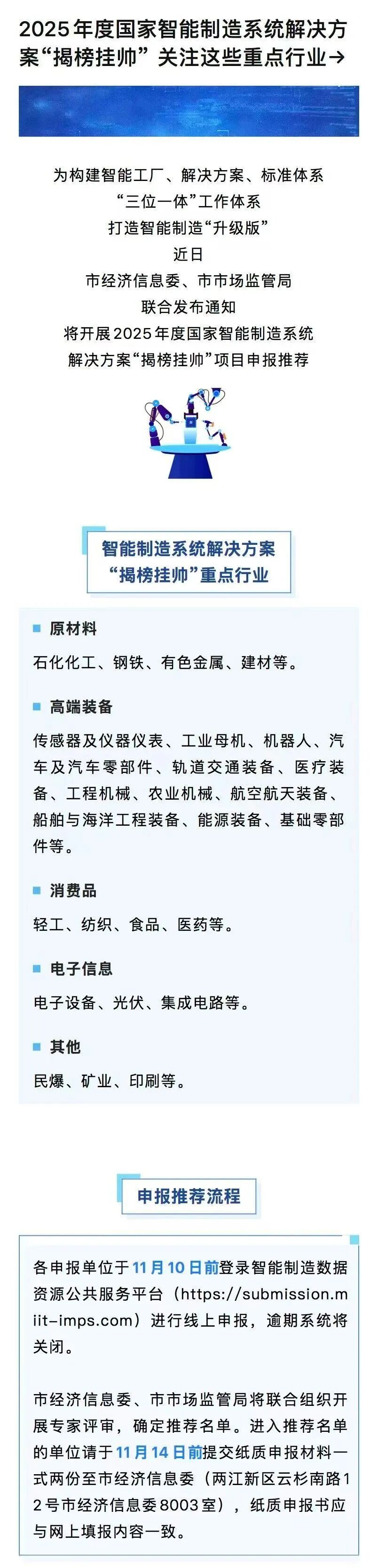 重庆市经济和信息化委员会2025年10月29日扫一扫在手机打开原文往期推荐:一图读懂《关于征集重庆市“工业母机+”典型应用场景的通知》一图读懂2025年度智能制造系统解决方案“揭榜挂帅”项目申报和已揭榜项目验收工作通知一图读懂《关于组织开展2025年度国家绿色工厂、绿色工业园区申报管理工作的通知》来源:重庆市经济和信息化委员会声明:除原创内容及特别说明之外,推送稿件文字及图片均来自网络及各大主流媒体。版权归原作者所有。如认为内容侵权,请联系我们删除。
