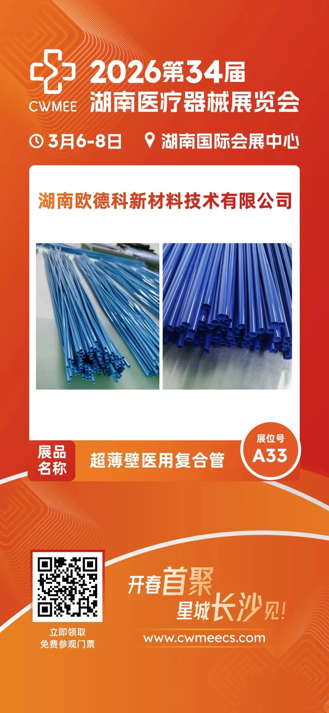 开春首聚,星城长沙见!2026第34届湖南医疗器械展览会(CWMEE)即将盛大启幕,湖南欧德科新材料技术有限公司将携核心展品超薄壁医用复合管重磅亮相,与行业同仁共话医用高分子精密导管的创新与发展。🌟 核心展品抢先看:超薄壁医用复合管