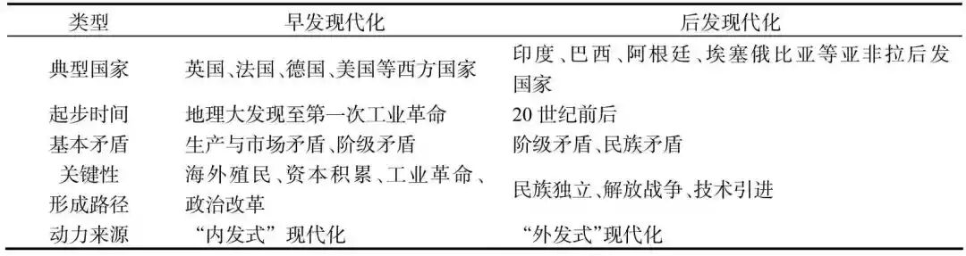 现代化并非只有一种类型。布莱克(1989)指出,现代化特征对于所有社会都具有一般性特征,但是各个社会的差异非常之大,没有两个社会以同一种方式实现现代化。因此,在现代化进程中不同变量的作用使各个国家的现代化路径既有一般性特征,又有异质性特征,现代化并不具备广泛意义上的一般可完全复制路径。从历史进程看,人类现代化的发展有“早发”和“后发”两种类型。