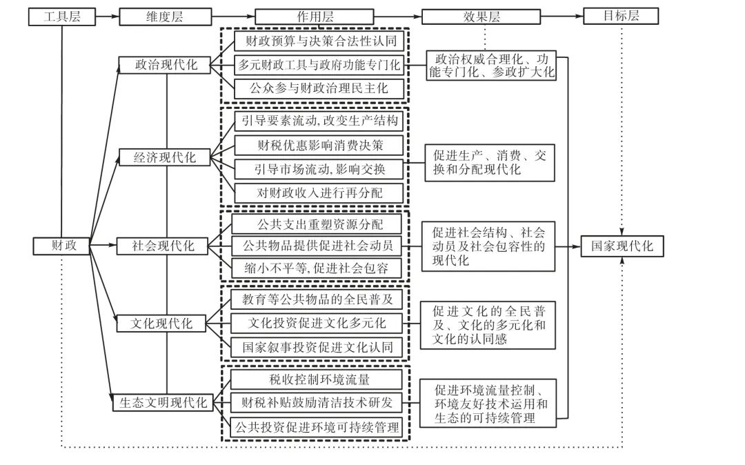 由此可见,财政与国家治理现代化是一个多维度、多层次的动态系统。这一系统包括政治、经济、社会、文化和生态等多个子系统,它们之间相互交织、相互影响。作为系统的核心组成部分,财政通过与其他子系统的交互作用,发挥着联结和协调的功能。财政政策和工具,如预算、税收、转移支付等,成为连接政治、经济、社会、文化和生态文明等领域的纽带。通过财政杠杆,国家能够调节资源配置,平衡不同利益主体的诉求,从而推动各个子系统的协调发展,最终实现国家现代化。