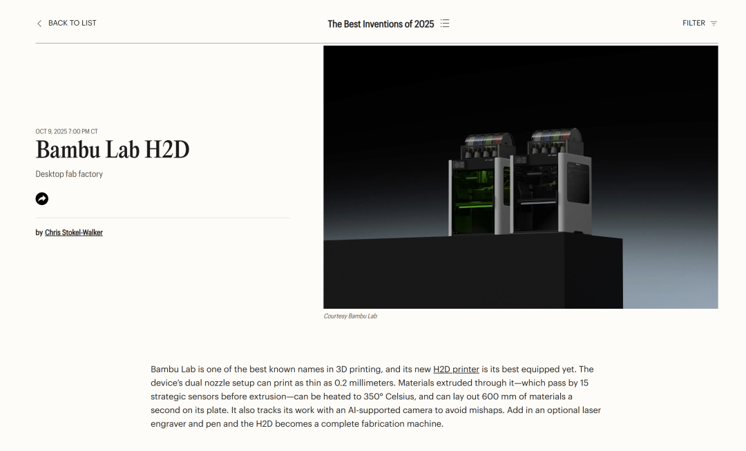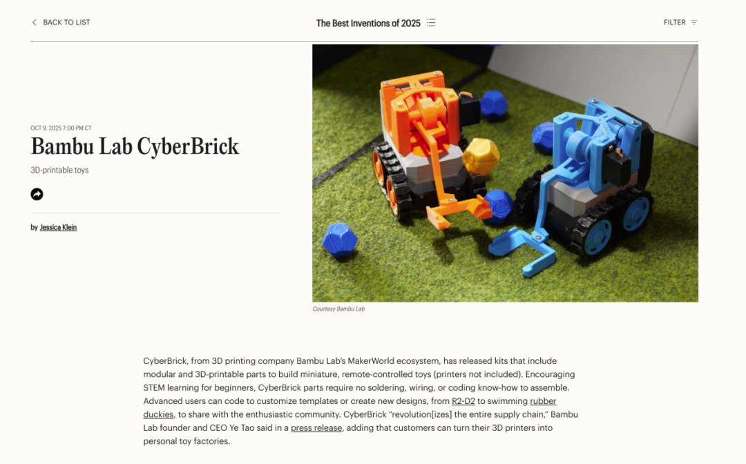 你是否听说过有人用3D打印技术成功的复刻了故宫?没错,3D打印在我国已经相当普及,在这背后离不开国产3D打印公司的努力。拓竹科技是一家专注于智能3D打印技术的高科技公司,它以其颠覆性的产品设计和卓越的打印质量,迅速在全球3D打印爱好者及专业用户中赢得了极高的声誉,目前它正丰富其业务面积逐步利用其3D打印技术进军多个领域。它的H2D和CyberBrick更是同时被时代周刊评选入围2025最佳发明。