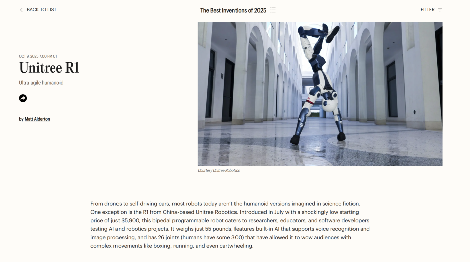 你是否还记得前不久举办的机器人舞蹈大赛上那些憨态可掬的机器人?你是否会有疑问,中国的机器人技术现在发展怎么样了呢?事实上,宇树科技已经在该领域深耕了近10年,目前已设计出Unitree A1、Unitree B2、Unitree R1等多款产品,其中Unitree R1更是被时代周刊评选入围2025最佳发明。