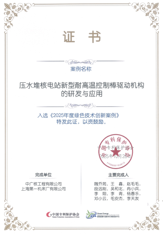 》要求及国家“双碳”战略决策部署,推动双碳产业专利成果产业化,加快绿色创新成果向新质生产力转化,助力企业国际化发展,促进全球产业创新协作。工程公司研发并应用的新型耐高温控制棒驱动机构产品成果从全国近200个案例中脱颖而出,成功获评2025年绿色技术创新案例并在此次会议期间发布,向世界展示了中国核电品牌和绿色技术创新发展能力。\"]]],[\"p\",{}],[\"p\",{}],[\"p\",{}],[\"p\",{},[\"span\",{\"data-type\":\"text\"},[\"span\",{\"data-type\":\"leaf\"},\"现有国内外压水堆核电站反应堆顶部须带有通风系统,存在堆顶结构复杂、在役检验困难、运维大修时间长等行业难点问题。由中广核工程有限公司研发的压水堆核电站新型耐高温控制棒驱动机构,具有耐高温、长寿命、高可靠性和高安全性特点,能够在无堆顶强制通风条件下长期稳定运行,成功解决该行业难题。该机构的成功研发与应用显著提高了设备可靠性和核电站运行经济性,创造了优异的技术效益、经济效益和社会效益。\"]]]]"},"namespaceURI":"http://www.w3.org/1999/xhtml"},"para",{"tagName":"p","attributes":{"style":"line-height: 2em;margin-left: 10px;margin-right: 10px;"},"namespaceURI":"http://www.w3.org/1999/xhtml"},"node",{"tagName":"span","attributes":{"style":"font-size: 15px;letter-spacing: 1.5px;font-family:黑体, SimHei, STHeiti;"},"namespaceURI":"http://www.w3.org/1999/xhtml"}]">本次会议由国家知识产权局、中国专利保护协会、世界知识产权组织中国办事处组织开展,旨在全面贯彻落实《国务院办公厅关于印发<专利转化运用专项行动方案(2023-2025年)的通知>》要求及国家“双碳”战略决策部署,推动双碳产业专利成果产业化,加快绿色创新成果向新质生产力转化,助力企业国际化发展,促进全球产业创新协》要求及国家“双碳”战略决策部署,推动双碳产业专利成果产业化,加快绿色创新成果向新质生产力转化,助力企业国际化发展,促进全球产业创新协作。工程公司研发并应用的新型耐高温控制棒驱动机构产品成果从全国近200个案例中脱颖而出,成功获评2025年绿色技术创新案例并在此次会议期间发布,向世界展示了中国核电品牌和绿色技术创新发展能力。\"]]],[\"p\",{}],[\"p\",{}],[\"p\",{}],[\"p\",{},[\"span\",{\"data-type\":\"text\"},[\"span\",{\"data-type\":\"leaf\"},\"现有国内外压水堆核电站反应堆顶部须带有通风系统,存在堆顶结构复杂、在役检验困难、运维大修时间长等行业难点问题。由中广核工程有限公司研发的压水堆核电站新型耐高温控制棒驱动机构,具有耐高温、长寿命、高可靠性和高安全性特点,能够在无堆顶强制通风条件下长期稳定运行,成功解决该行业难题。该机构的成功研发与应用显著提高了设备可靠性和核电站运行经济性,创造了优异的技术效益、经济效益和社会效益。\"]]]]"},"namespaceURI":"http://www.w3.org/1999/xhtml"},"para",{"tagName":"p","attributes":{"style":"line-height: 2em;margin-left: 10px;margin-right: 10px;"},"namespaceURI":"http://www.w3.org/1999/xhtml"},"node",{"tagName":"span","attributes":{"style":"font-size: 15px;letter-spacing: 1.5px;font-family:黑体, SimHei, STHeiti;"},"namespaceURI":"http://www.w3.org/1999/xhtml"}]">作》要求及国家“双碳”战略决策部署,推动双碳产业专利成果产业化,加快绿色创新成果向新质生产力转化,助力企业国际化发展,促进全球产业创新协作。工程公司研发并应用的新型耐高温控制棒驱动机构产品成果从全国近200个案例中脱颖而出,成功获评2025年绿色技术创新案例并在此次会议期间发布,向世界展示了中国核电品牌和绿色技术创新发展能力。\"]]],[\"p\",{}],[\"p\",{}],[\"p\",{}],[\"p\",{},[\"span\",{\"data-type\":\"text\"},[\"span\",{\"data-type\":\"leaf\"},\"现有国内外压水堆核电站反应堆顶部须带有通风系统,存在堆顶结构复杂、在役检验困难、运维大修时间长等行业难点问题。由中广核工程有限公司研发的压水堆核电站新型耐高温控制棒驱动机构,具有耐高温、长寿命、高可靠性和高安全性特点,能够在无堆顶强制通风条件下长期稳定运行,成功解决该行业难题。该机构的成功研发与应用显著提高了设备可靠性和核电站运行经济性,创造了优异的技术效益、经济效益和社会效益。\"]]]]"},"namespaceURI":"http://www.w3.org/1999/xhtml"},"para",{"tagName":"p","attributes":{"style":"line-height: 2em;margin-left: 10px;margin-right: 10px;"},"namespaceURI":"http://www.w3.org/1999/xhtml"},"node",{"tagName":"span","attributes":{"style":"font-size: 15px;letter-spacing: 1.5px;font-family:黑体, SimHei, STHeiti;"},"namespaceURI":"http://www.w3.org/1999/xhtml"}]">。中广核工程研发并应用的新型耐高温控制棒驱动机构产品成果从全国近200个案例中脱颖而出,成功获评2025年绿色技术创新案例。此次会议对评选出的15个获奖案例进行了集中发布。该成果的入选,向世界展示了我国核电品牌和绿色技术创新发展能力。