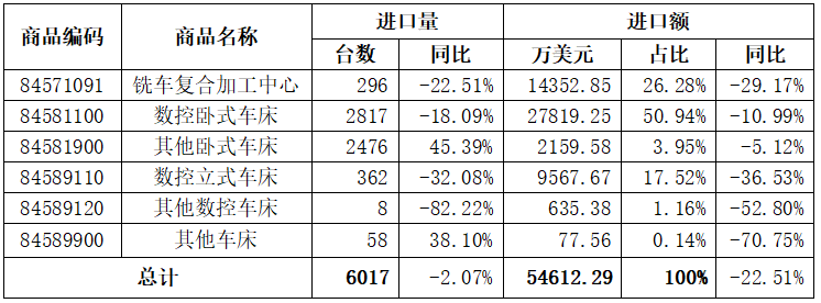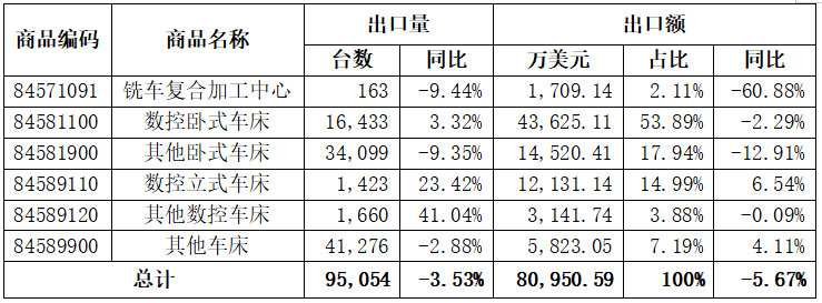 进出口产品结构调整,进口方面,高附加值产品铣车复合加工中心进口减少,部分中低端产品其他卧式车床进口量增加;出口方面,数控立式车床出口量和出口额均增长,铣车复合加工中心等高端产品出口减少。