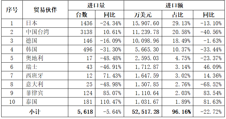 各类细分产品中,铣车复合加工中心从日本进口215台、进口额5652.78万美元,其次是德国进口38台、进口额2888.28万美元;数控卧式车床从日本进口1125台、进口额9108.13万美元,其次是中国台湾进口639台、进口额5888.66万美元,具体如下。