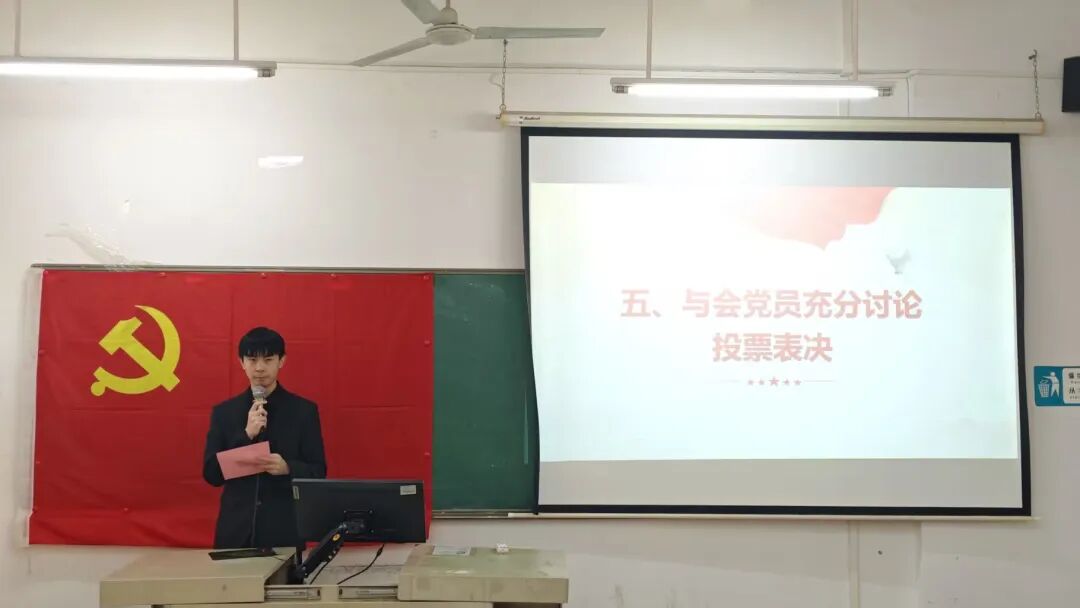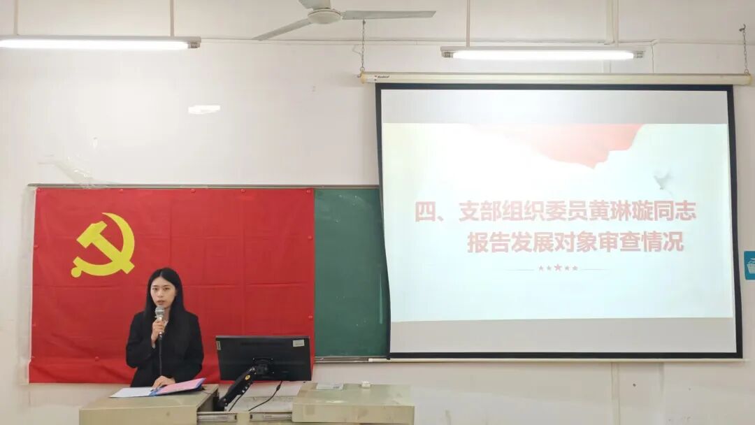 大会第四项议程,学生第一党支部组织委员黄琳璇同志报告黄烁鹏等6名发展对象的审查情况,认为他们对党的认识深刻且准确,入党动机纯正,能够以端正的态度接受组织的考验。在经过一系列的培训和考察后,他们均表现良好,符合成为一名中国共产党党员的条件。因此,同意将这6名发展对象提交至支部大会进行讨论和表决。