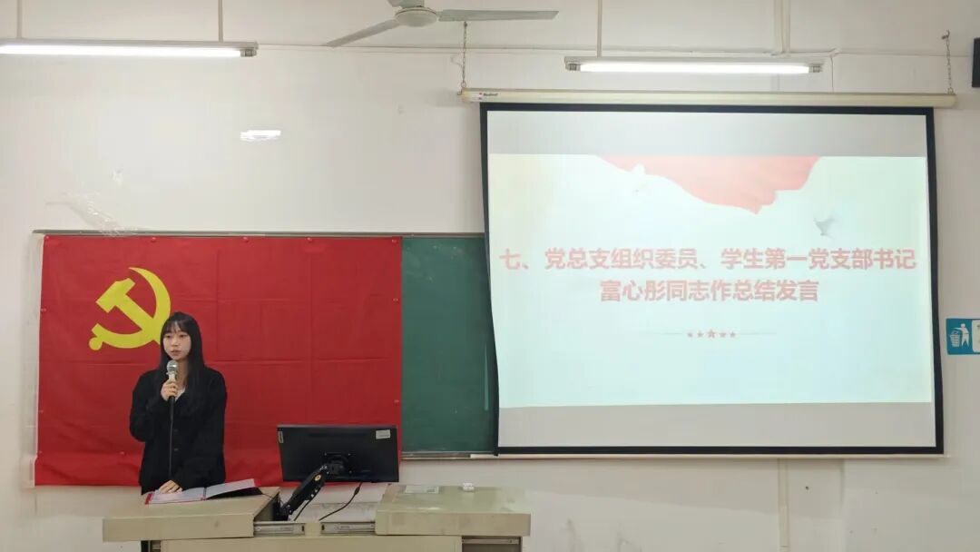 大会第七项议程,学院党总支组织委员、学生第一党支部书记富心彤同志作总结发言,她首先对新发展的预备党员表示祝贺,她强调,新同志的加入为党组织带来了新的活力,希望大家珍惜党员身份,牢记初心使命,在学习和生活中发挥先锋模范作用。她表示,党员们要不断加强自我修养,提高政治觉悟,积极参与社会实践,服务人民,服务社会,以实际行动影响和带动周围的人,共同 推动社会主义事业的发展。