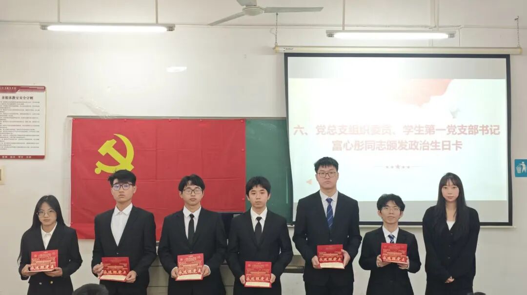 大会第六项议程,学生第一党支部组织委员富心彤同志颁发政治生日卡。富心彤同志庄重地为黄烁鹏等6名同志颁发政治生日卡。每当一张政治生日卡被递交到他们手中,他们的脸上都洋溢着诚挚的目光和无比的自豪感。这一刻,这张看似小巧的卡片承载了无尽的重量,更是未来新征程的起点,唤醒了他们内心滚烫的初心和肩上沉重的使命,让他们对于未来的信念变得更加坚定。