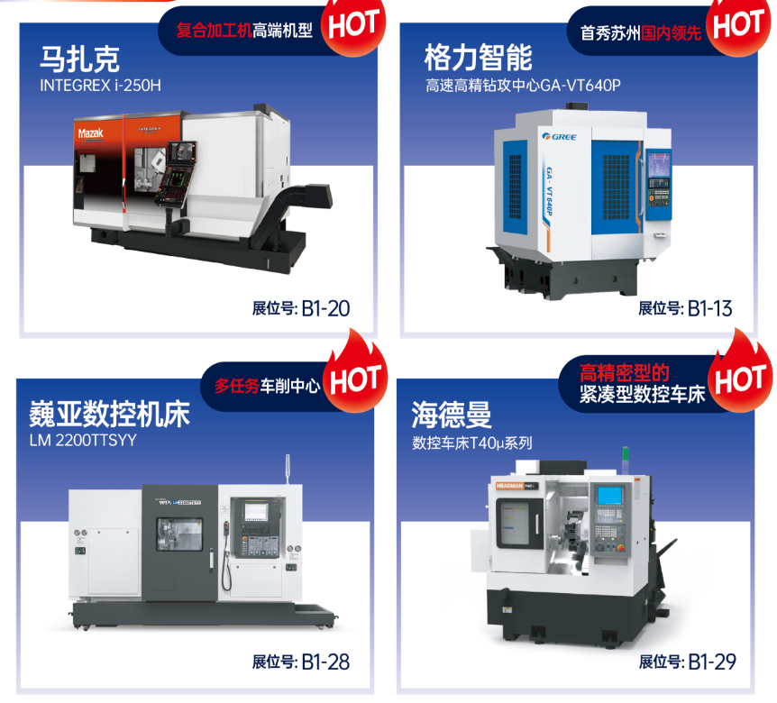 苏州国际博览中心B1\D1\C1\E1四馆全开,集结了马扎克、西铁城、迪恩、津上、发那科、格力、海德曼、巍亚数控、牧野、丽驰、蔡司、海克斯康、三丰、基恩士、力劲、迪蒙、三光等海内外一线品牌,不仅有“王炸”级的重型装备,更有针对精密零部件加工的“热销爆品”。