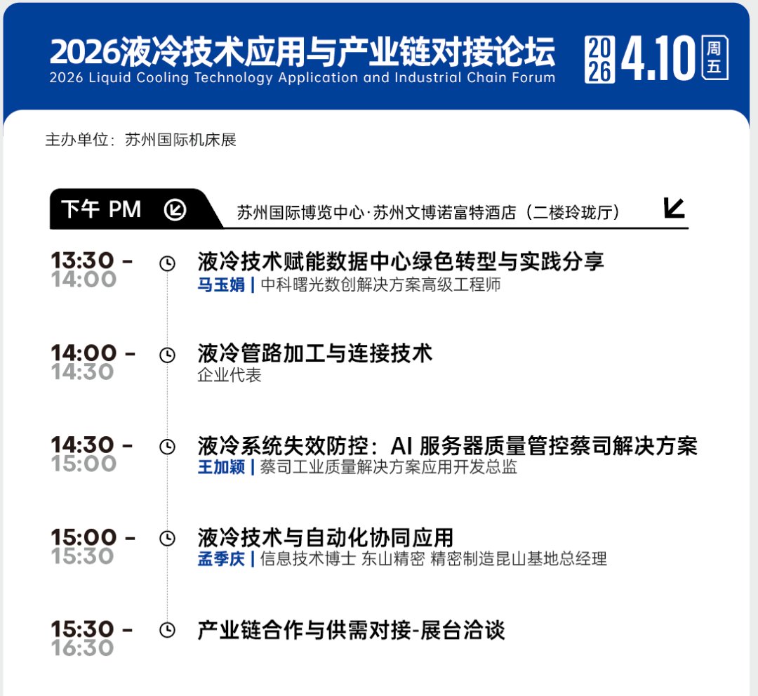 本次论坛深度聚焦液冷系统失效防控、自动化协同应用及数据中心绿色转型等核心议题。届时,蔡司工业质量专家将详解AI服务器质量管控方案,东山精密高管将分享精密制造中的自动化协同实战。